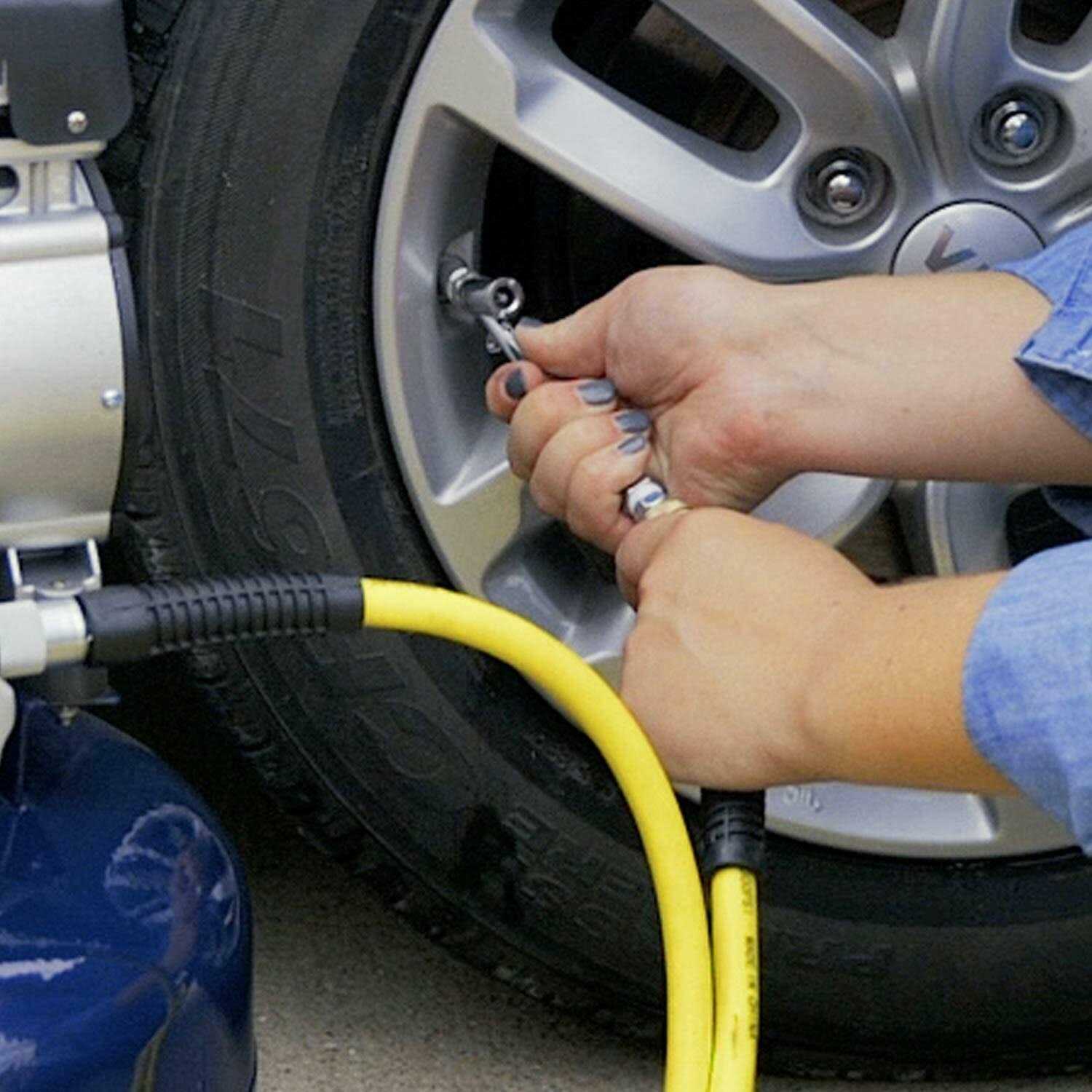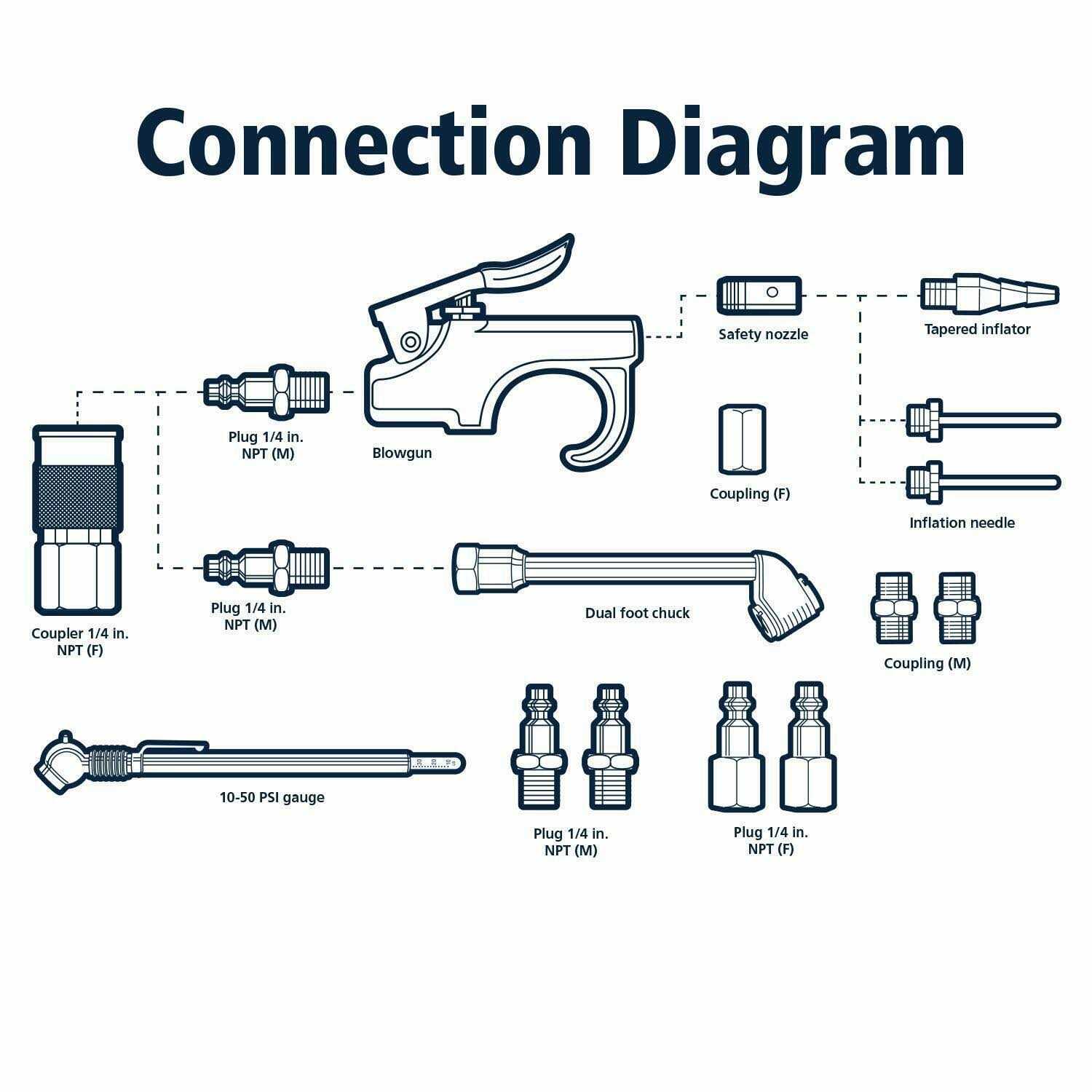 When you have a compressor but lack the appropriate connector this set has it all. Kit includes blow gun coupler four 14-Inch male plugs safety nozzle tapered inflator two inflation needles dual Foot chuck 50 PSI gauge female coupling two 14-Inch female plugs and two male coupling. Couplers are designed to withstand a minimum of 25000 life cycles without leakage. Plugs are cold forged for superior strength and durability.