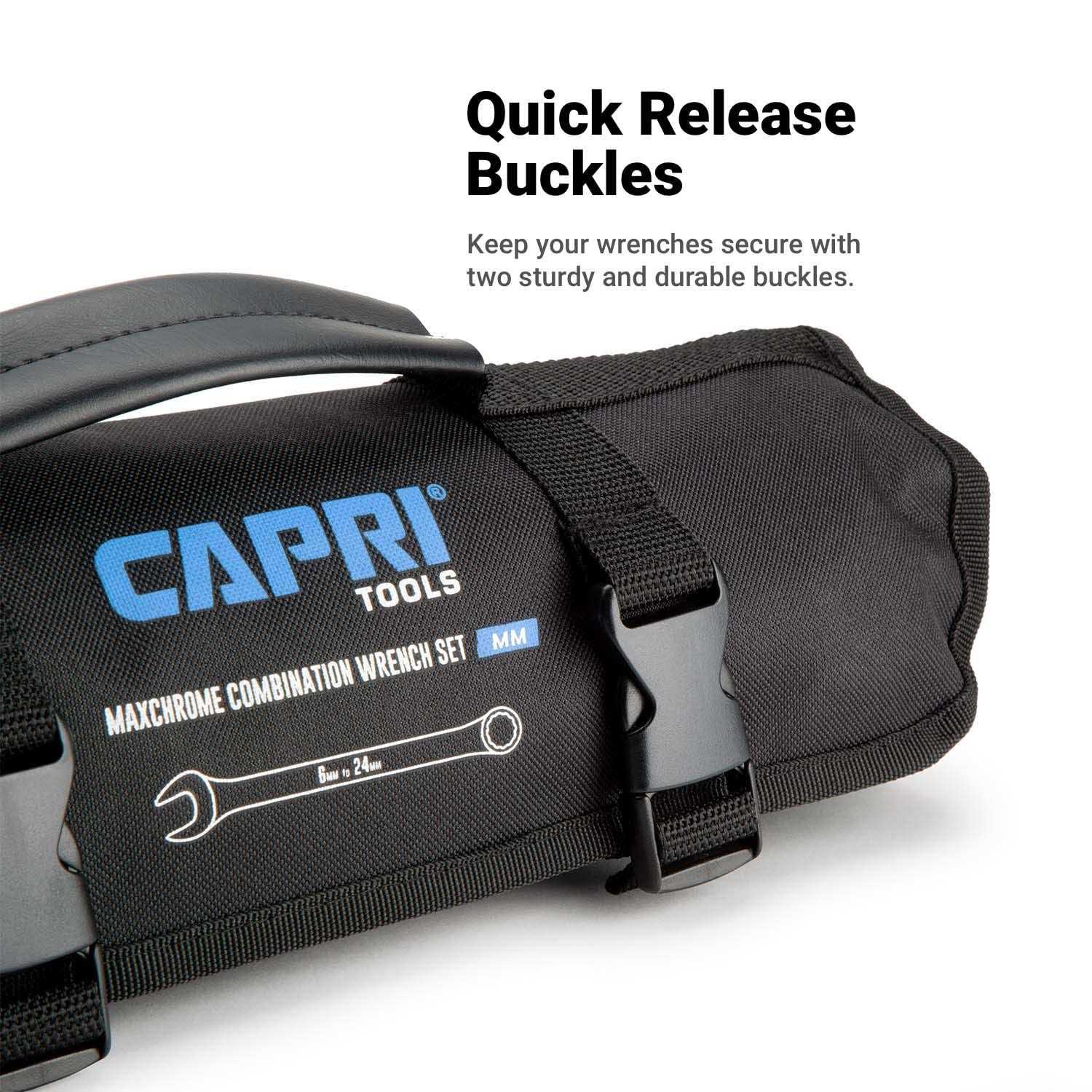 The Capri Tools heavy-duty canvas roll-up wrench organizer pouch is made to help make carrying and organizing your favorite wrenches a breeze. Made with heavy-duty polyester canvas, the pouch is long lasting, water resistant and does not retain moisture. The organizer pouch comes with 19 pockets marked with sizes 6 mm, 7 mm, 8 mm, 9 mm, 10 mm, 11 mm, 12 mm, 13 mm, 14 mm, 15 mm, 16 mm, 17 mm, 18 mm, 19 mm, 20 mm, 21 mm, 22 mm, 23 mm, 24 mm. 2 quick release buckles let you open and close the pouch quickly, and secure the content when the pouch is closed. The pouch is compact and easy to carry both when it’s rolled up or laid flat. Color: Black.