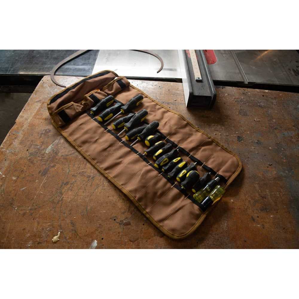 - Tool roll made of rugged synthetic material with Rain Defender durable water repellent for protecting and organizing tools