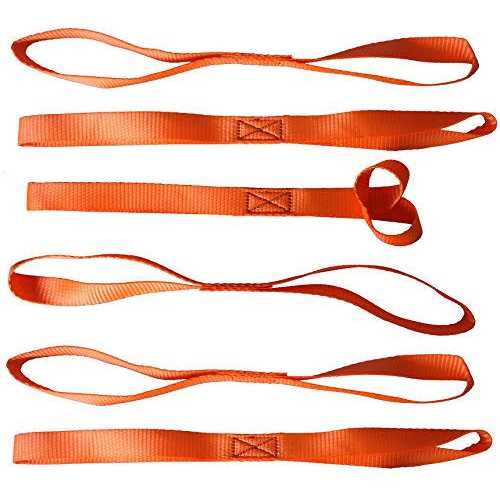 Tie-Downs by CARTMAN. 2,300 LB capacity per strap. One end twisted loop prevents your strap from being tangled while tying onto your machine. High visibility, orange color is easy to spot. Polyester material has less stretch and much higher UV resistance than nylon. Double Stitched for added strength.