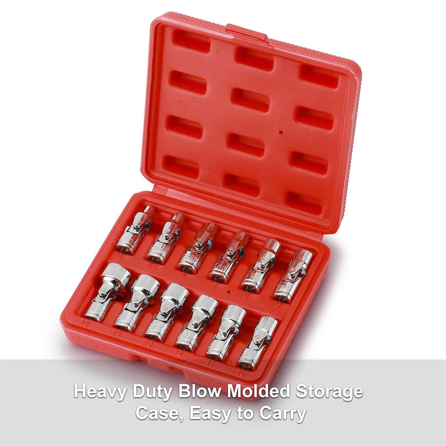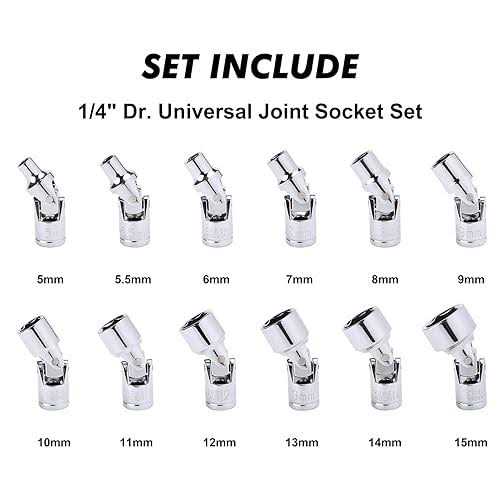CASOMAN 12pcs 1/4″ Drive Universal Flex Socket Set, Metric, 5mm to 15mm, 6-Point, Cr-v, Swivel Head, 360 Degree Access