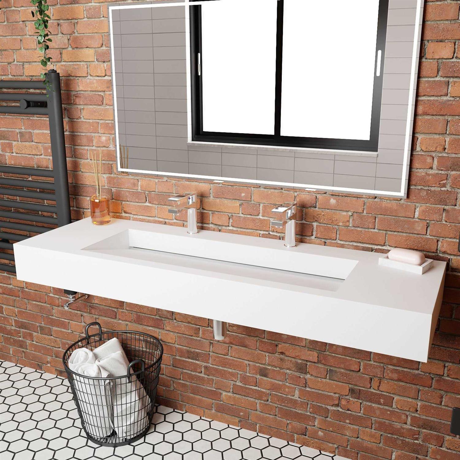 Embrace modern design and feel with this minimalist wall-mounted sink. Simple yet sophisticated, this modern sink is designed to look as if it is floating in your bathroom. Its standard rectangular design works well in many bathroom decor configurations and setups. The angular design of the sink basin leads the eye to the back of the sink wall, making it unique compared to other standard sinks. Made with high-quality and durable solid surface material, this sink features a clean and consistent color throughout as well as durable construction to ensure lasting quality and appearance. The surface can be easily cleaned with most non-abrasive cleaning agents. A great accent for any washroom, bathroom, or power room. NOTE: Each piece is handcrafted and handfinished. Pieces may have small marks, unpolished spots, or slight variations in shape, size, or color compared to what is pictured. No two pieces will be exactly the same.