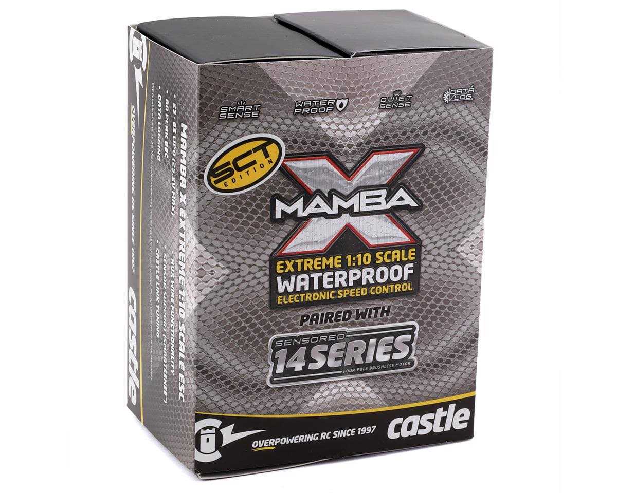 The Castle Creations Mamba X SCT 1/10 Brushless Combo includes the Mamba X, with the awesome 1412 Sensored motor to create a all in one system perfect for 1/10 scale 2WD and 4WD SCT up to 6.5lb (3S) as well as 1:10 scale 2WD buggies and stadium trucks (2S-4S). The Mamba X SCT is going to shake things up. Extremely versatile, and capable of powering a wide variety of applications and vehicles the Mamba X SCT is ideal for racing at the track with your 2wd buggy or bashing through mud puddles in your monster truck. The high performance Mamba X SCT includes an integrated and powerful 8A adjustable BEC and can push the most extreme 1/10th scale setups and 1/8th scale race buggies. Through the use of Castle’s Smart Sense technology, the position of the rotor is always known by the ESC. This eliminates the possibility of encountering cogging or inconsistency during startup, and allows the 1412 to deliver PRECISE throttle control and BUTTERY SMOOTH starts – with the RAW POWER and LONGER RUN TIMES that Castle motors are known for.