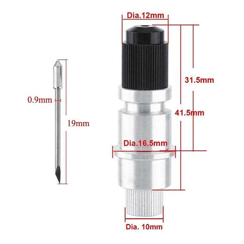 Growtech CB09 Graphtec Blade Holder with 10pcs 30 45 60 Degree Cutting BladesProduct Specification:Blade Holder Material: Carbide Length: 51.8 mm(2.04 inches) Compatible with: Graphtec CB09U CB09 Cutting Blades Material: Hard Alloy Length: 19.8mm(0.78 inch) Diameter: 0.9mm Degree of Blade: 30 / 45 / 60 30 Blades (Blue cap) for Cutting large fonts and thick materials which about 1mm.(eg: reflective material, masking tapes, etc.) 45 Blades (Red cap) for Cutting general fonts and vinyl film.(eg: vinyl for traffic sign, flocks, etc.) 60 Blades (Yellow cap) for Cutting very small font & intricate line-art logos.(eg: any thin vinyls) Notice: 1. Blade should not extend too long, generally within half a millimeter is better, while paying attention to extended blade longer properly when carve the small print, in order to avoid the blade holder take the carved strokes away. Suitably engraved small print with new cutter and slow down. 2. When the word carved with angular phenomenon, you should change the blade to eliminate the problem, if the phenomenon persists after change blade, it should be the holder problem. 3. When problem arise the blade holder, try a drop of oil in the bearing and rotate the blade several times to lubricate, if still unresolved, consider replacing the blade holder. Package Included: 1 x*Blade Holder 5 x*45 Cutting Blade 3 * 60Cutting Blade 2 * 30Cutting Blade 10 *Springs