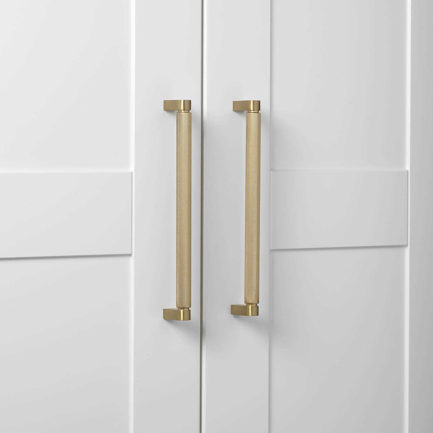 GlideRite Hardware This textured, heavy-weight knurled bar pull features a complex diamond pattern that will add an up-to-date and unique look to your kitchen, laundry room, or bath. The knurled design gives you an easy-to-grip handle. Matching knobs are also available.