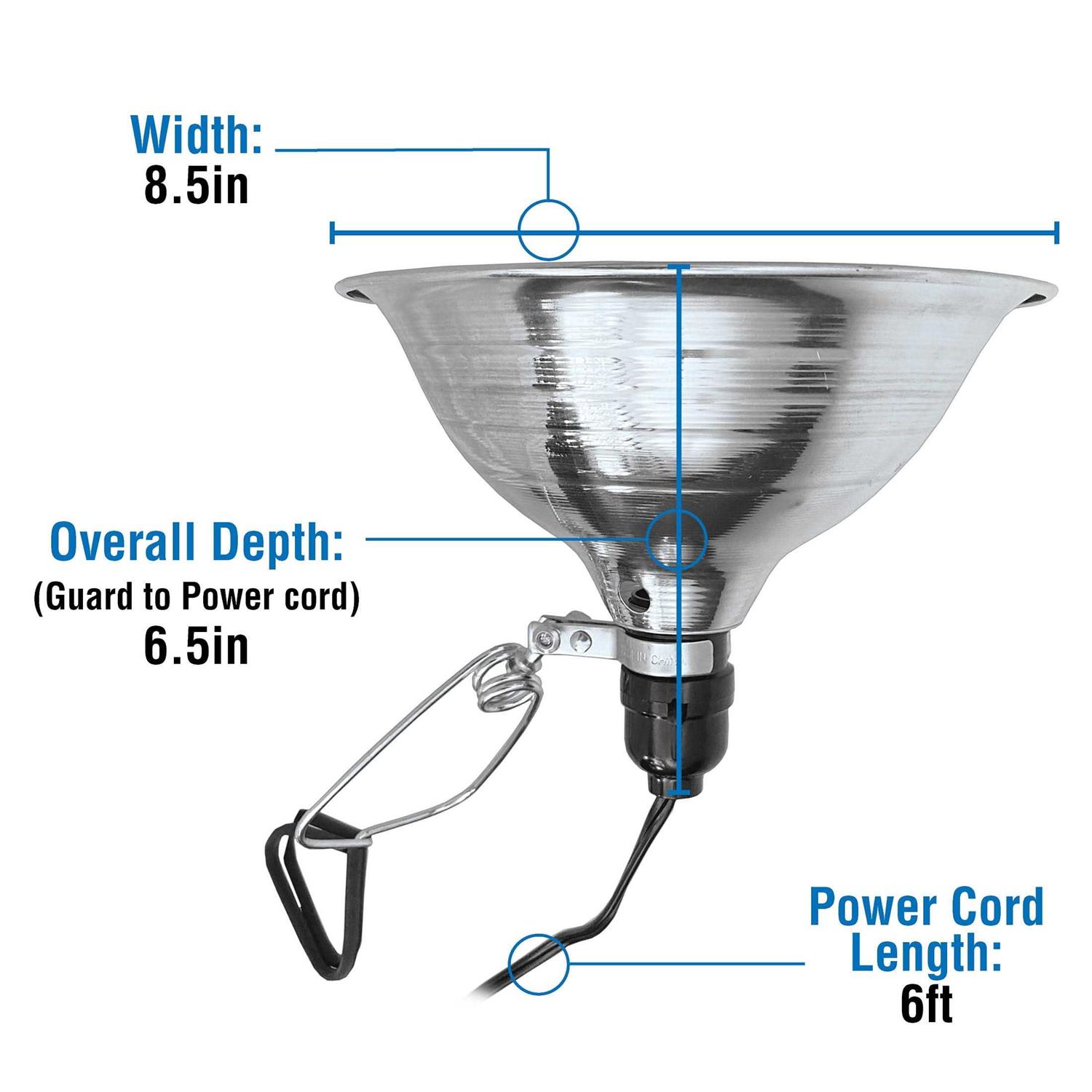 The Champion Electronics 8.5 inch Clamp Light is the perfect tool for your garage, barn, attic, or workshop. It conveniently attaches to many locations with the steel spring clamp and the ball joint enables the direction of light to be adjusted as needed. No bulb is included, allowing you to choose the best light for your application. The medium base socket accepts halogen, incandescent, and LED bulbs up to 150 watt maximum. A vinyl sleeve covers the clamp surface to secure the light and provide scratch resistance to most surfaces. The aluminum reflector also comes with a 6 foot cord and a switch allows simple on/off control of the unit. Do not use in the presence of flammable or combustible material or Hazardous Locations. For Dry Indoor Use Only.