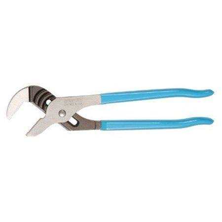 Channellock Tongue and groove plier features straight jaw that has a dimension of 1.5-Inch x 0.5-Inch. It has a capacity to cut 2-1/4-Inch wire. The blue handle has comfort grip. The 12-Inch plier features carbon steel construction and polished finish that ensure long lasting durability. It can be adjusted to seven different sizes. Right angle, laser heat-treated teeth ensures better grip and long life. It has patented reinforcing edge that minimizes stress breakage. Plier meets ANSI B107.23 standards.