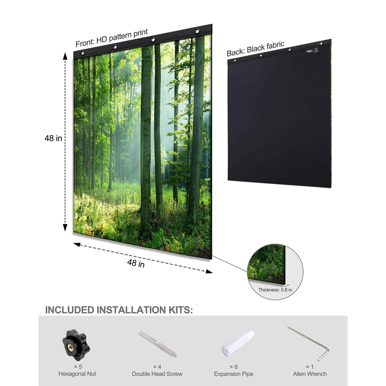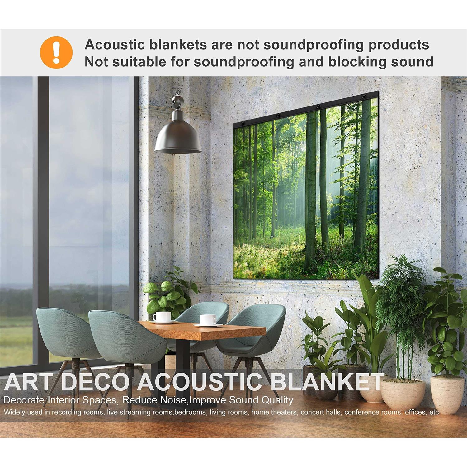 THE BEST ACOUSTICAL TREATMENT SOLUTION — This acoustic blanket is not a soundproofing product and is not intended to block sound. It is designed for sound absorption,which can effectively reduce reverberation and echo, remove sound impurities, improve sound effect. It is definitely your best choice for recording audio, optimizing live streaming, reducing room noise, improving sound environment and quality. ROOM DECORATION — Modern Design. The Sound Absorption Blankets has various high-definition patterns printed on its surface. It can beautify the space and make you feel in a natural and comfortable environment, achieving an excellent audio-visual experience. It can be widely used in recording studios, vocal rooms, drum rooms, home offices, home theaters, conference rooms, apartments, etc. EXTRA LARGE AREA/DOUBLE-SIDED AVAILABLE — The Sound Absorption Blanket is a three-layer structure, with the upper and lower layers of densified sound absorbing fabric, and the middle is a high-density polyester sound absorbing foam panel rich in pores and fibers. After the sound enters the pores, the sound energy is converted into heat energy and absorbed. The expanded size of the panel is 48 “x48” inch, with a thickness of 20mm. The front is patterned, and the back is pure black. EASY TO INSTALL — The package comes with an installation kit (including screws, nuts, expansion tube, Allen wrench, installation manual). You can easily complete the installation without worrying about falling. Please refer to the manual for the detailed installation process. The Sound Absorption Blankets can be removed, rolled, or folded for storage at any time when it does not require work or cleaning. AFTER-SALES GUARANTEE: — The Sound Absorption Blanket is packed in compression. Please lay it flat or hang it for 48-72 hours after receiving it to restore its original size. The fabric wrinkles caused by compression can be restored to flatness by steam ironing. CHOOVEEON was created specifically for acoustic processing work and is an innovator in acoustic products. Each of our products has been carefully designed, tested, and manufactured. br br Note: This Blanket is not suitable for blocking sound, Just to absorb and dampen sound. /b br br Product parameters: /b br Size: 48 “x48” inch (plus or minus 0.8 inch) br Thickness: 0.8 inch br Weight:1.74kg br Fabric: 100% polyester sound absorbing fabric br Filler: 100% polyester fiber sound absorbing foam panel br Sound absorption rating: 0.85 NRC Rating br br The sound absorption effect achieved in a room depends on the size of the space being processed, the number and position of sound absorption blankets used, as well as the amplitude and frequency of sound. If you want a better sound environment, you should use our blankets on more reflective walls. br br Sound Absorption and Noise Reduction, Decorative Space, Windproof and Moisture-proof, Breathable and Lightweight, Easy to Install, Storable, Non-toxic and Tasteless, Economical and Recyclable. br br Cleaning instructions: /b br Please use water-based cleaner, foam or pure anhydrous solvent for cleaning. br It is recommended to gently brush or vacuum to remove accumulated dust and dirt. br Not machine washable, but can be dehydrated by a washing machine and hung to dry. Do not expose to direct sunlight. br br Precautions after receiving goods: /b br The Sound Absorption Blanket is packed in compression. After receiving the goods, please lay them flat or hang them for 48-72 hours to restore the original size. The fabric wrinkles caused by compression can be restored to flatness by steam ironing.