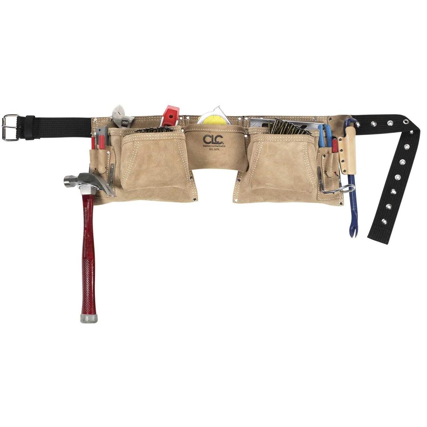 Keep tools and equipment handy with this custom Leathercraft 12-Pocket Suede Apron. It features four deep main compartments in addition to eight smaller slots and sleeves. A centrally placed pouch makes carrying tape measures, nails and other tools a breeze. Made from heavy-duty suede leather, this tan apron boasts double gussets to keep the front pockets wide open for easy access while working on projects. It also possesses an adjustable 2 inch poly web belt with a roller buckle, making it easy to slip on and comfortably wear. Constructed using superior-quality materials, this multi-pocket construction apron provides a convenient way to keep your tools and materials within reach when you need them most.