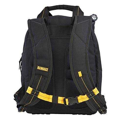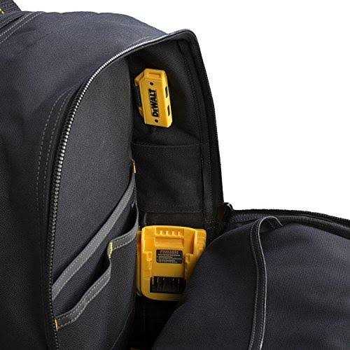 USB charging battery dock simultaneously charges 2 devices via USB ports. Maximum 2 amps shared output. 3 internal charging wall pockets can hold a tablet phone and/or camera and can charge 2 devices through a USB connection to a 20V MAX Lithium battery pack. Low battery cut-off protection monitors battery voltage to avoid battery over-depletion. Integrated 2-level LED light system allows adjustment for wide area illumination or close-up work. Multiple interior panels hold a multitude of tools and accessories like drills extension cords pliers screwdrivers wrench sets drill bits testers and much more. 31 multi-use pockets inside and 2 outside help organize a wide variety of hand tools. Padded web carrying handles and adjustable shoulder straps make carrying more comfortable and convenient. Large pads on back for extra comfort makes carrying heavier loads more comfortable on stress areas of the back. Easy double-pull heavy-duty zipper. Base pad feet helps reduce wear and abrasion. Maximum initial battery voltage (measured without a workload) is 20 volts. Nominal voltage is 18.