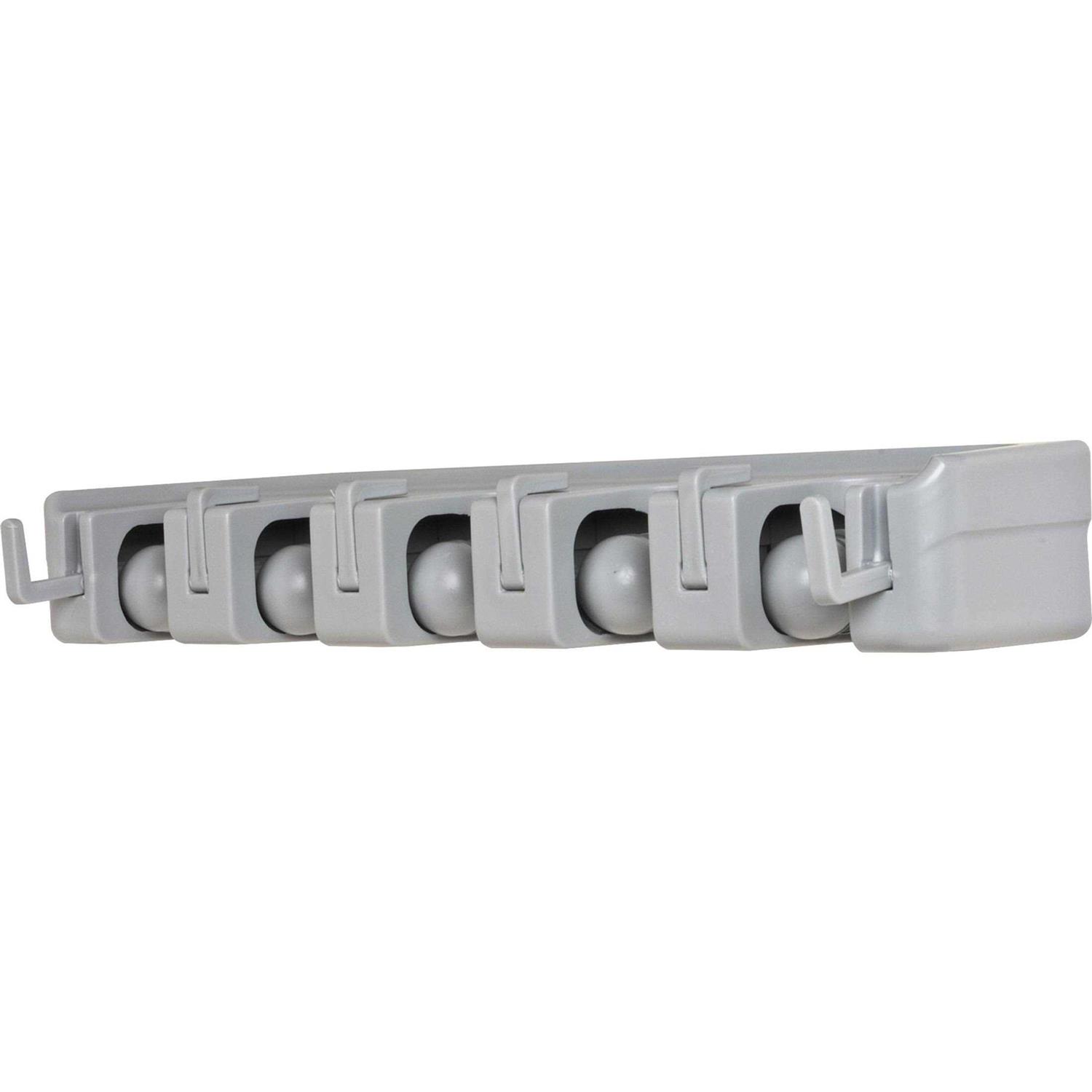 Wall organizer rack for cleaning tools is designed to hold five objects with handles of varying thicknesses, plus six additional hangable objects. Just insert handle into one of five slots and a rounded, gravity controlled, rolling ball automatically adjusts to its thickness and grips it securely. Then hang hangable object on one of six hooks. Organizer rack is ideal for brooms, mops, tools and more in your office, laundry, garage, garden, utility room and more. Rack is made of sturdy ABS plastic and includes mounting hardware. Rack measures 16-1/2 wide x 3-3/4 deep x 2-3/4 high.