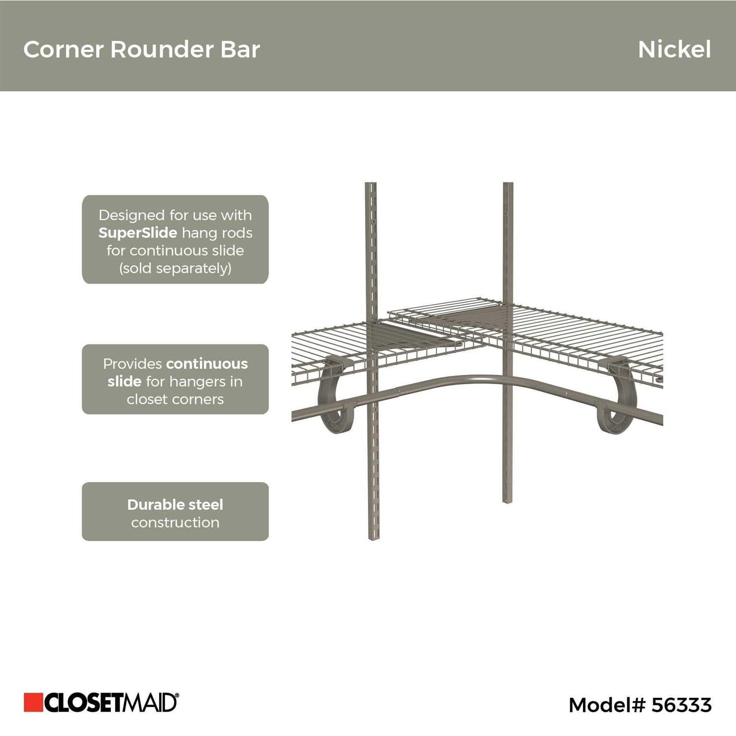 The smooth tubular design of the ClosetMaid SuperSlide Corner Closet Rod lets hangers slide freely, offering easy hanger adjustment. The durable body is constructed of steel for strength and resistance to sagging. This curved closet rod makes great use of corner space. The rod is part of the SuperSlide storage system that is perfect for closets and other areas where hanging items are needed. Color: Nickel.