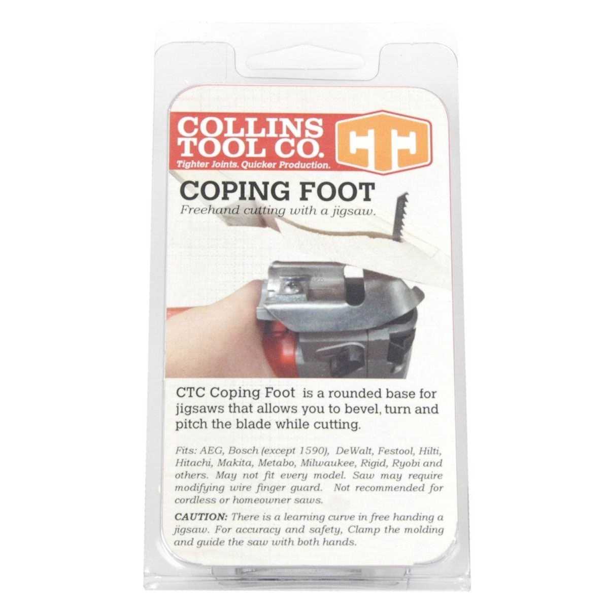 Of all the coping jigs and machines out on the market today, none really comes close to the simplicity, practicality, and outright effectiveness of the Collins Coping Foot. It turns an ordinary jigsaw into an accurate coping machine. The dome shaped foot mounts to the jigsaw’s base plate, and allows you to bevel, turn, and pitch the blade to any angle as you cut. No matter which way the saw is turned the blade is supported right at the kerf. You can freely cut andamp; back bevel on the go. Compact enough to cut into some extremely close quarters. Fits most jig saws except for Porter-Cable, and the Bosch 1590 andamp; 1591. Made from 14 gauge plated steel. Should outlast several saws. Includes helpful instruction sheet. Required Jigsaw and Jigsaw Blades sold separately.