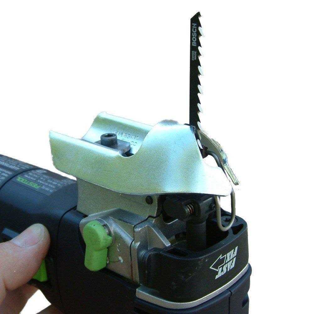 • The dome shaped foot mounts to the jigsaw’s base plate, and allows you to bevel, turn, and pitch the blade to any angle as you cut.