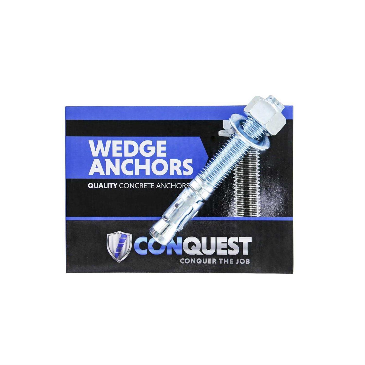 Conquest zinc wedge anchors are high quality concrete anchors designed for use in uncracked concrete. These hardened steel anchors are commonly used for installing racking, machinery, car lifts and all sorts of other fixtures. The zinc plating on these anchors is designed for installation in dry interior environments. All Conquest wedge anchors are marked on the top of the anchor body for easy length identification once installed.
