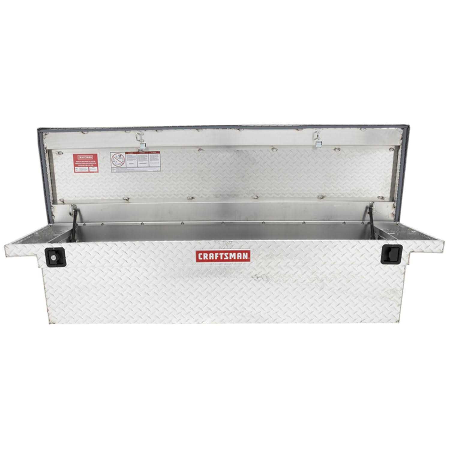 Craftsman Bright Aluminum Full-size Truck Tool Box has fully welded aluminum construction and a weather block seal to protect your stored items. Easy to use ergonomic paddle handles locks on the driver side. The low profile allows greater visibility through the rear window.