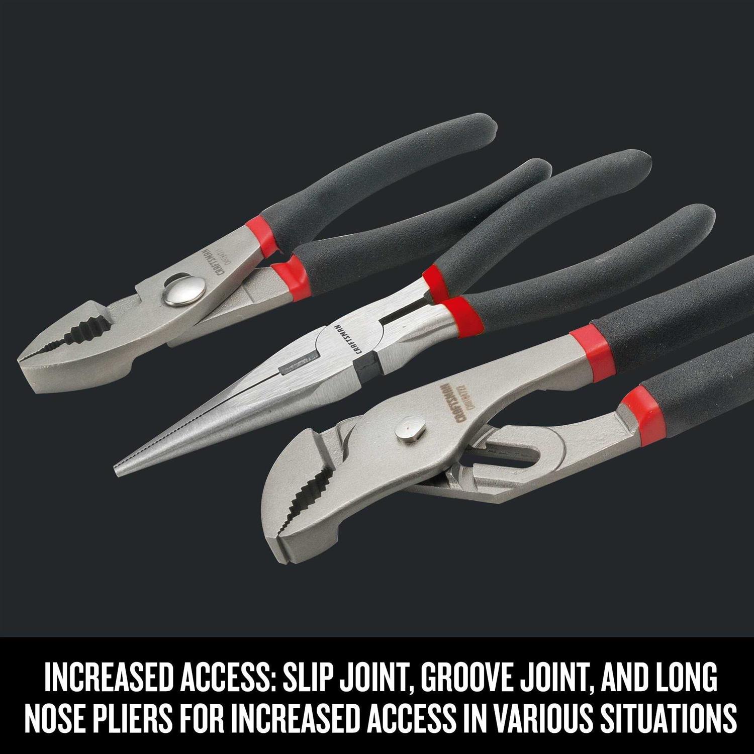 - Slip joint, groove joint, and long nose pliers come with the socket tool kit for increased access in various situations.