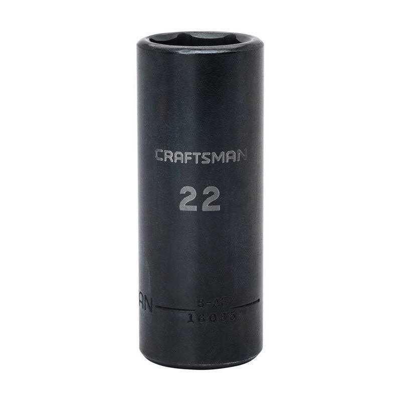 Craftsman 22 mm x 1/2 in. drive Metric 6 Point Deep Impact Socket Sold ASCase of 3 Product Overview Impact tools get the job done faster with less effort. Easy-To-Read laser etched size markings makes it easy to locate the right socket for the job. Great for working in low-lit or greasy environments. Permanent marking resists chipping, fading and corroding. 1/2 in. size drive22 mm Metric 6 point impact socket Impact tools get the job done faster with less effort Laser etched size markings makes it easy to locate the right socket for the job Great for working in low-lit or greasy environments Permanent marking resists chipping, fading and corroding Black oxide finish and Made of alloy steel Easy to read Impact sockets are for use with impact drivers Socket wall dimensions are optimized to provide strength while providing access to restricted fasteners.