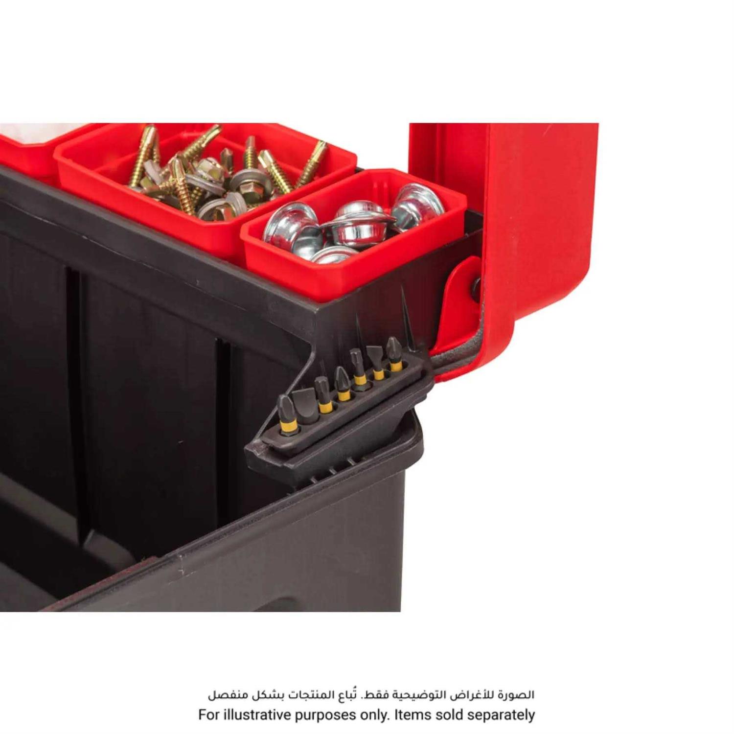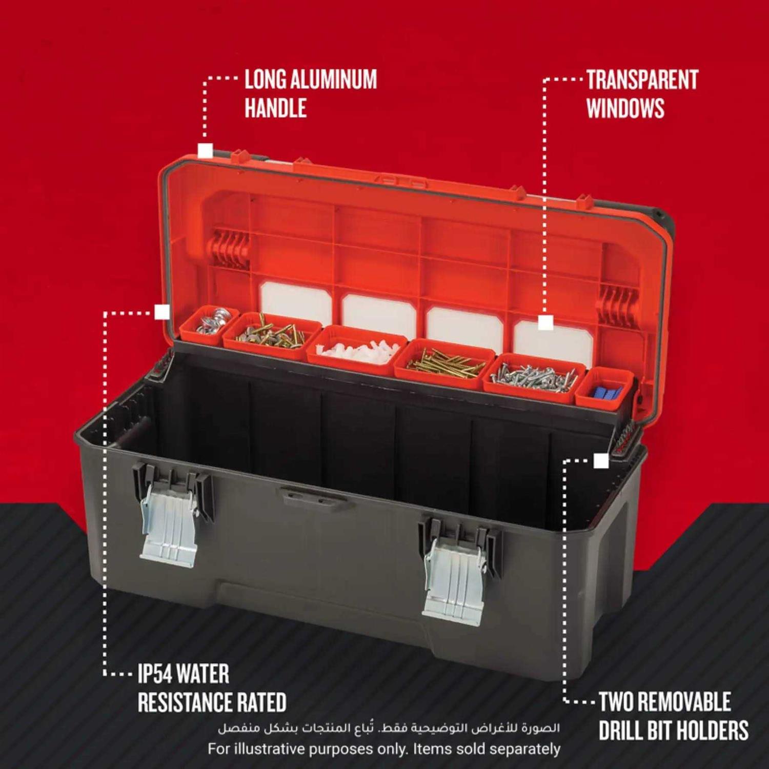 Transparent windows on lid for visibility of cup contents without opening the tool box. Long cantilever sliding tray with removable cup compartments in two sizes suitable for hand tools and accessories. Long aluminum handle for better grip making it comfortable and easy to carry or lift. Two removable screwdriver bit holders. Large durable rust-proof metal latches. 77 lbs load capacity. IP54 rated – for dust and water protection.