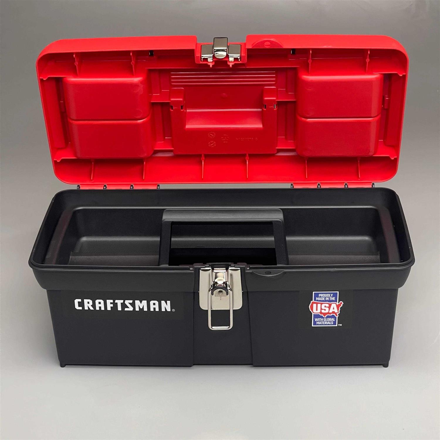 Tool Boxes by Craftsman. Details:Keep your supplies neat, organized and in one central location for easy access with this CRAFTSMAN 16″ Toolbox. It’s made of a sturdy material and comes pad lock ready (sold separately) for added safety. This plastic tool box has a spacious interior that you can use to hold a hammer, measuring tape, screwdrivers, a wrench and more. It also includes two top organizers and a removable tray that’s suitable for holding smaller handheld tools, screws, nuts and bolts and nails.