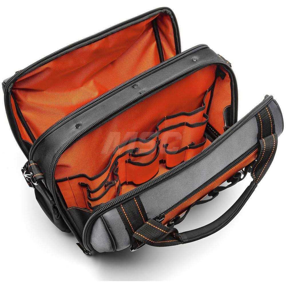 The newly designed sleeves hold the tools in place without losing small bits in the bottom of the pockets. The interior divide splits the bag into two sections to provide increased organization for identifying the right tools for the job. This bag features a hard polypropylene base that provides the durability you need to keep your tools safe and dry. Features Professional grade closed top bag is ideal for everyday use in rugged conditions. 3 exterior pockets and a 29-pocket interior tool wall provide additional organization, with pocket sleeves to easily access small pieces. Hard polypropylene base resists moisture and withstands impacts, delivering lasting durability. Bright orange interior helps you find your tools faster in darker environments. Made with 1680D polyester and metal hardware to withstand the toughest jobsite. 13 PALS on the outside of the bag provide tool storage slots for quick, easy access to your frequently used tools. Pocket sleeves hold the tools in place without losing small bits in the pockets. Adjustable, padded shoulder strap and padded nonslip bar handle make carrying the bag more comfortable. Includes a water bottle holder and a tape measure clip for added convenience.