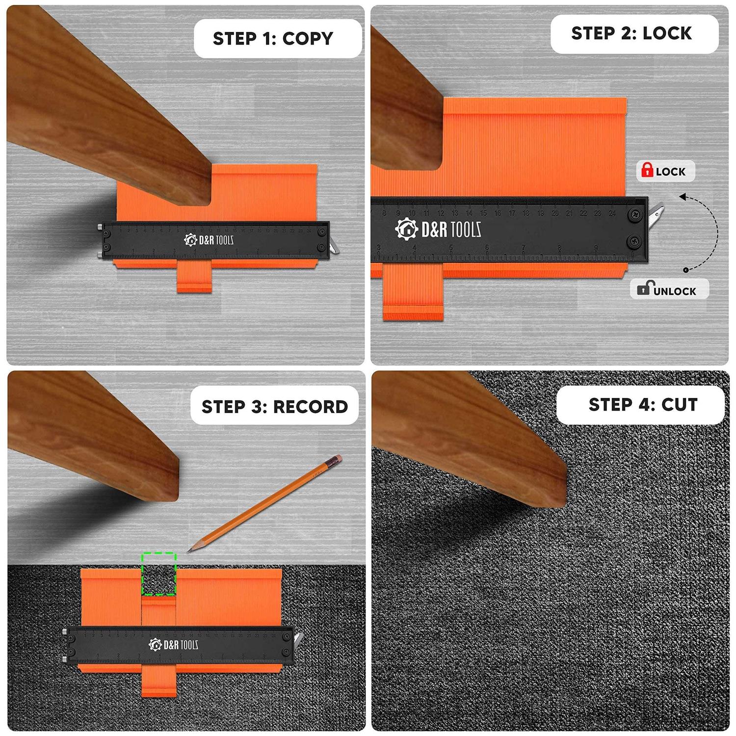 CONTOUR GAUGE PROFILE TOOL WITH LOCK / FLOORING TOOLS / TILES TOOLS- Contour Gauge with Lock Wider Shape Duplication Gauge Tool 5& 10, Template Tool with Adjustable Lock Precisely Copies Irregular Shapes Tools for Flooring Contour Gauge Duplicator D&R Tools Contour Gauge Tool with Metal Lock Two different sizes of marking gage with metal core in one package + Two free pencils. Makes measuring and cutting easier. Shape duplicator fits for measuring many irregular items. This can be best for fathers men gadgets / gifts, handy, painters, carpentry, remodeling, molding, carving, multifunctional copier, replicator, contour gage. This corner measuring tool can also be useful with measuring baseboard, holes , odd-shaped, lathe, weird surfaces, duct, designs measures, impression, shaper and any improvements.