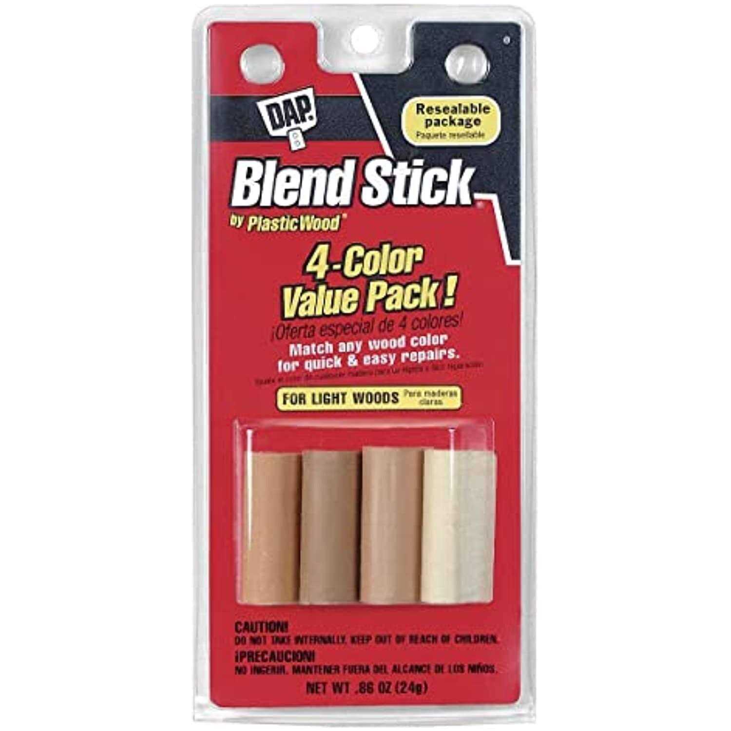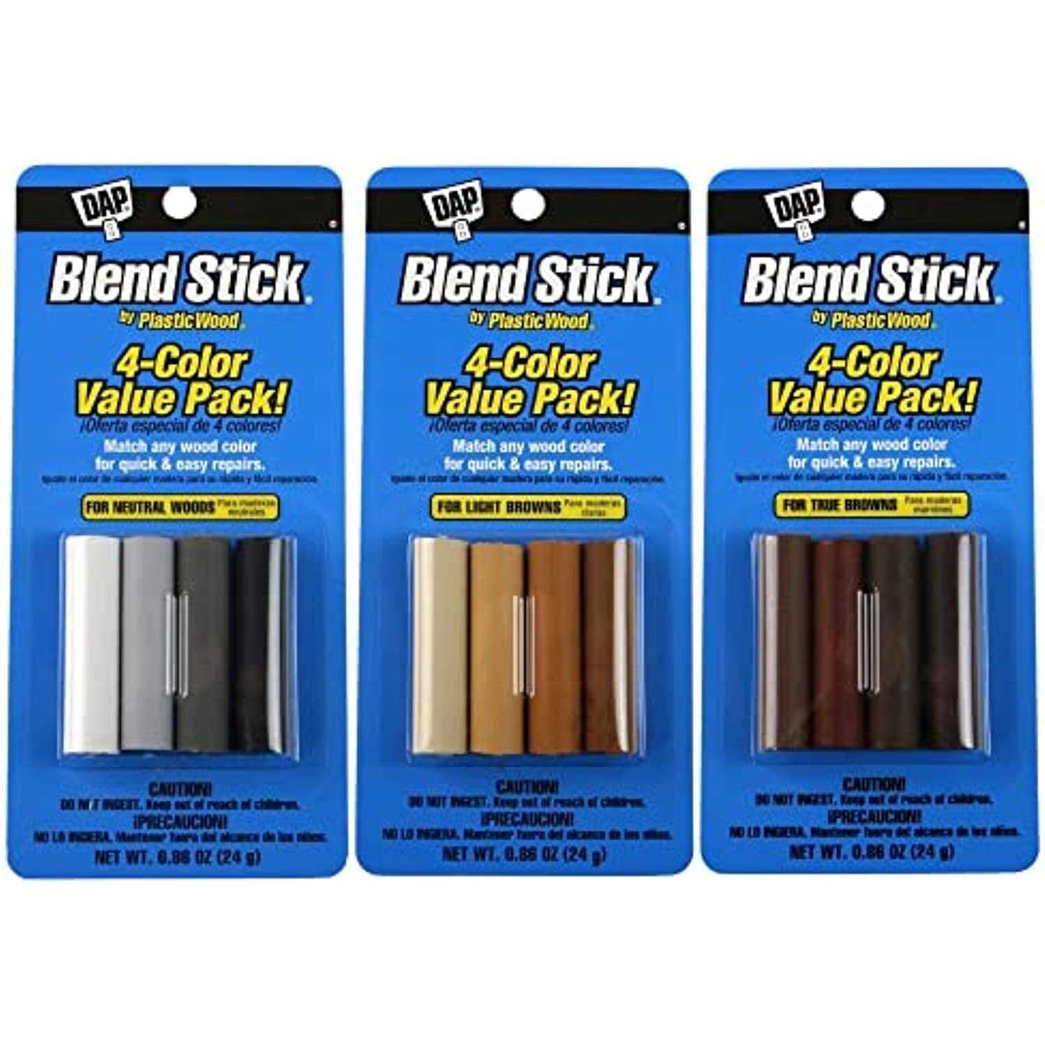 A fast, easy way to repair nail holes, scratches and other minor blemishes in finished wood surfaces. The four color sticks can be used individually or combined to match any wood tone. The Blend Stick’s unique teardrop shape makes it easier to use than other blending products. Ideal for wood and simulated wood surfaces such as paneling, woodwork, moulding, furniture and cabinets. It will not shrink, stain or discolor.