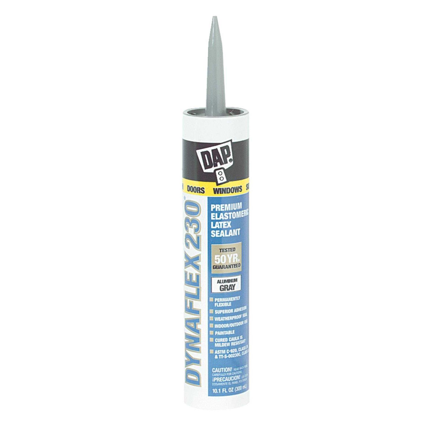 Dap Dynaflex aluminum gray 230 caulk is compatible with aluminum, concrete, drywall, glass, masonry, metal, plaster, plastic, stone, vinyl and wood materials with a 4 hr cure time. This caulk is waterproof and for use indoor / outdoor. Minimum to maximum operating temperatures are -30 F to +180 F.