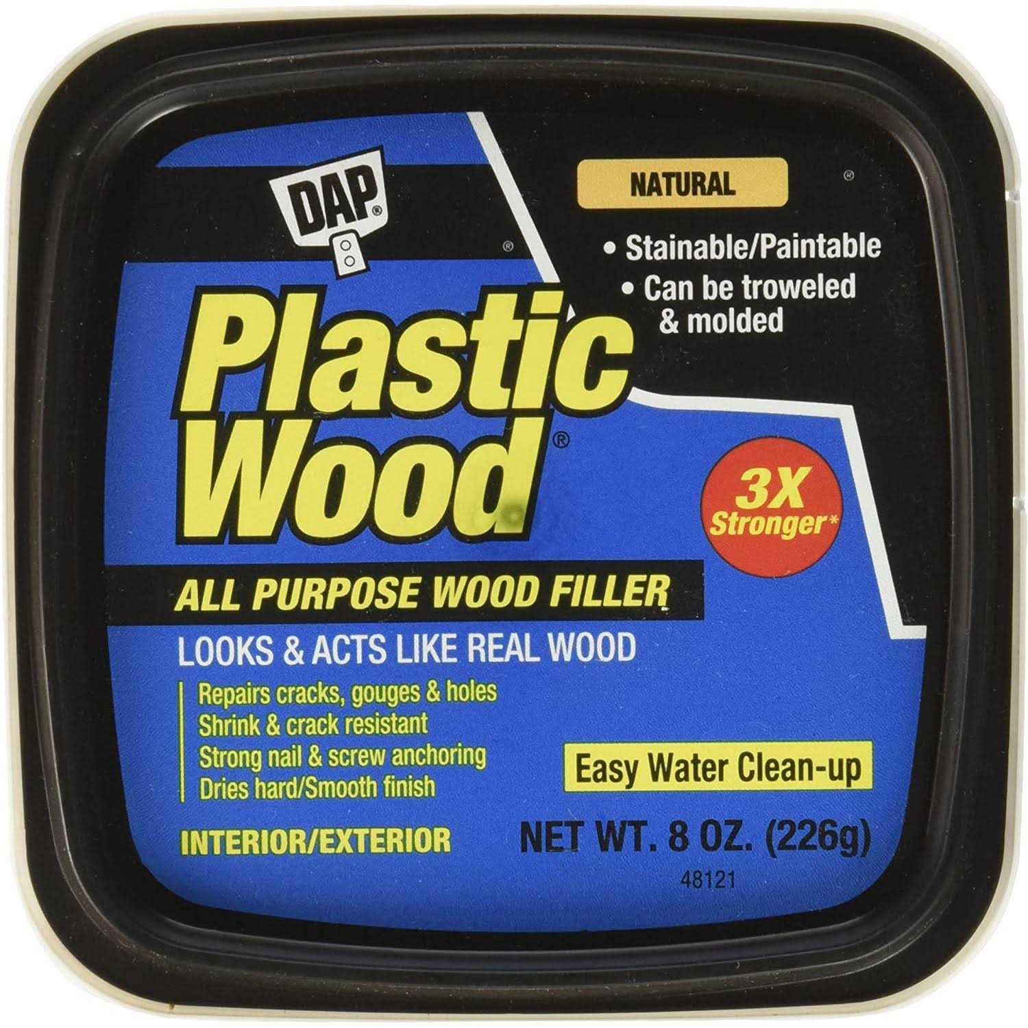Dap Plastic Wood is a high quality, latex-based wood filler formulated to match various wood finishes from a natural pine to dark walnut and several shades in between, including white. DAP’s Plastic Wood is the ideal choice whenever you need to repair cracks, gouges, holes and other surface defects on furniture, woodwork, molding, cabinets, paneling, plywood, windows, doors and even painted surfaces. Looks and Acts Like Real Wood. Repairs cracks, gouges and holes. When dry, it can be sanded, cut, planed, drilled, nailed, screwed, stained, and painted. Shrink and crack resistant. Strong nail and screw anchoring. Dries hard with a smooth finish. Indoor/ outdoor use.