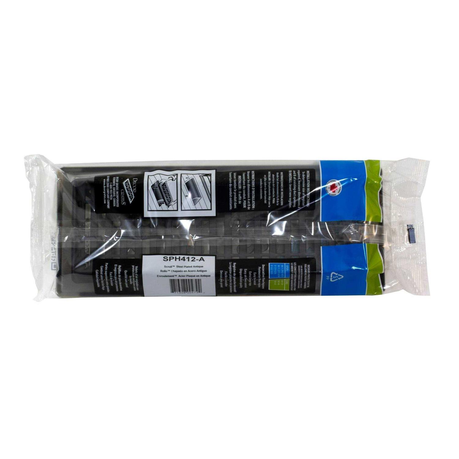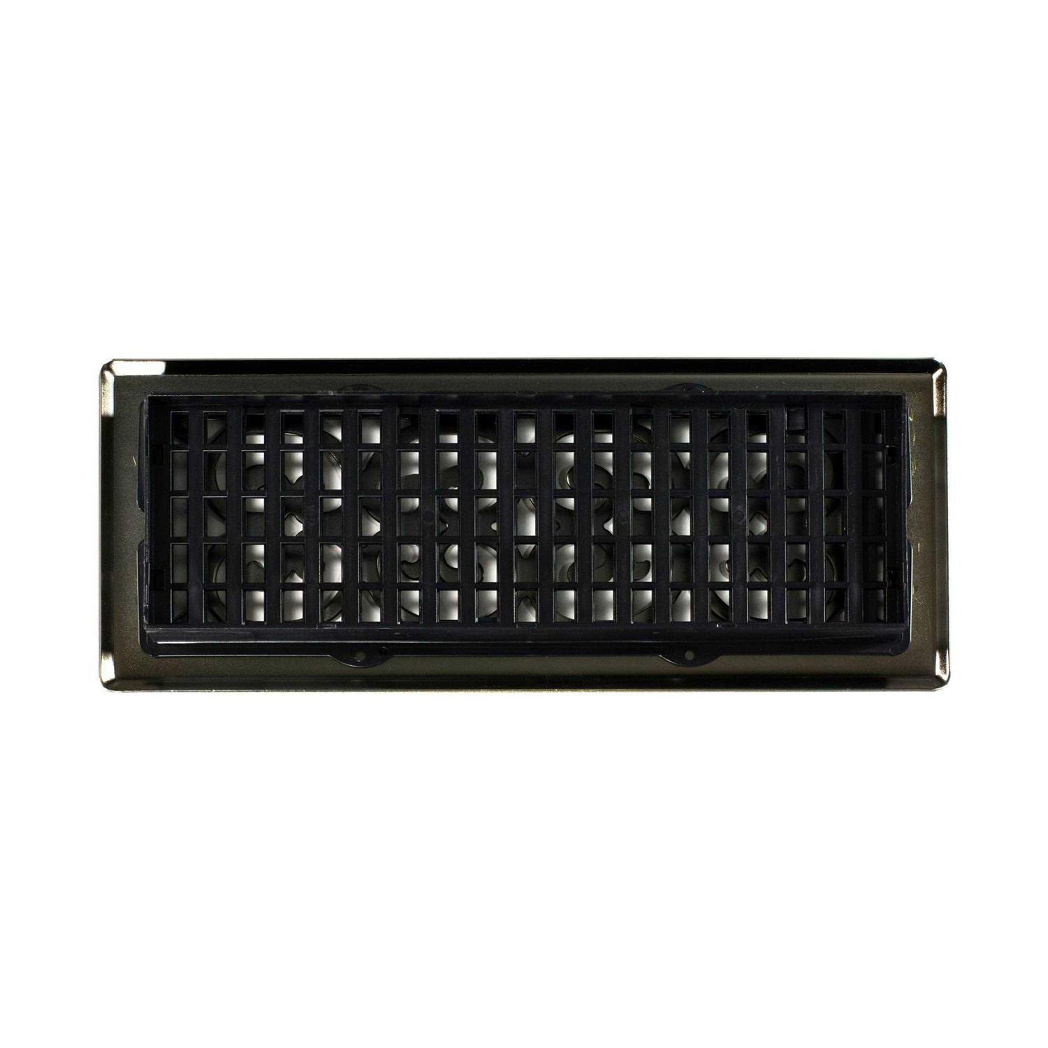 The Decor Grates 4 inch x 12 inch Scroll Antique Brass steel floor register is sure to match any home decor. The register is easy to install, fits well and features an extra-large top for better air flow. The grate comes with a high impact plastic damper box to allow easy air flow control. It fits a floor opening of four inches wide and 12 inches long.