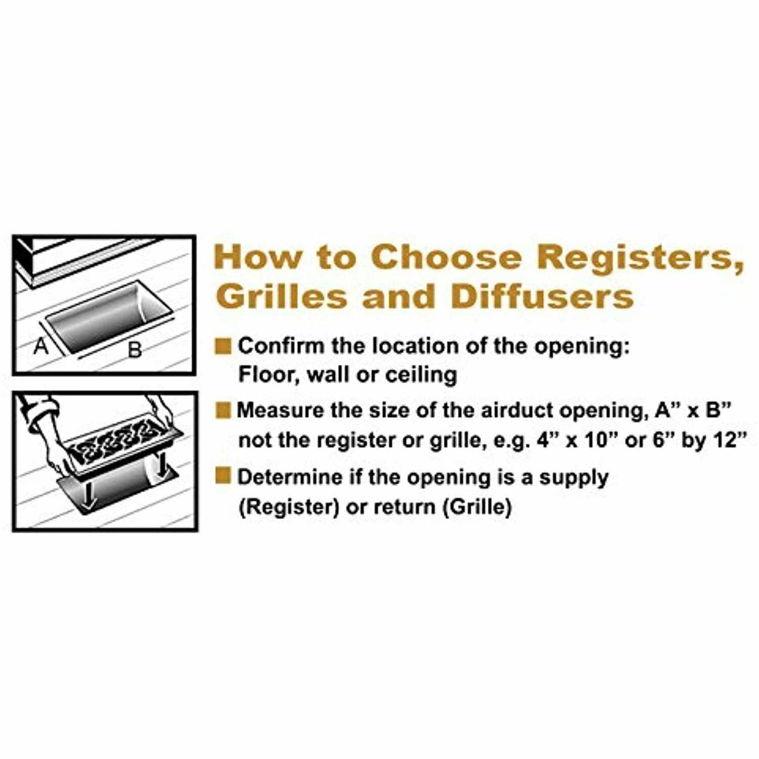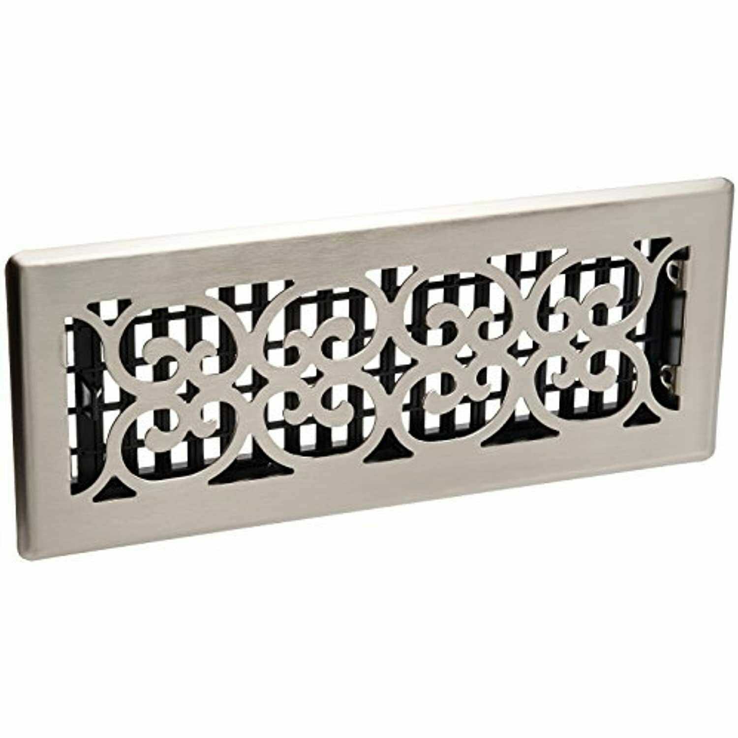 Scroll Design Steel Floor Register is an elegant addition to any home decor. The brushed nickel finish has a lacquered coating for added protection. The damper box is made from a high impact plastic, not metal which can rust and seize up. This is not a cheaper option, it’s the best option. The register fits a 4 in. x 12 in. opening. Made from sturdy steel to ensure long-lasting use Helps improve circulation of air Ideal for installing in floor openings Scroll design steel plated – brushed nickel finish floor register Fits in a 4 in. by 12 in. vent opening Lacquer finish protects your register surface High impact plastic damper box Protective lacquer finish For use in 10-1/8 – 12 in. H ducts with a width of up to 8 in. Scroll Floor Register in Brushed Nickel comes with traditional scroll design and protective lacquer finish. This decorative floor register will enhance your room and features an easy-to-use rustproof damper box.