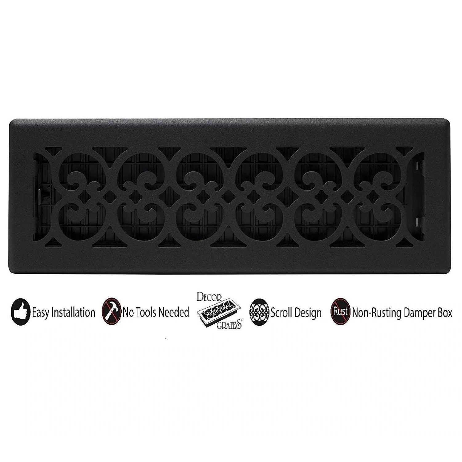 The Decor Grates 4 inch x 14 inch floor register is the perfect addition to any home decor. The textured black painted finish adds style. The rust proof high impact plastic damper box allows for easy air flow control. These grates are easy to install, simply remove the old grate and drop the new one in its place.