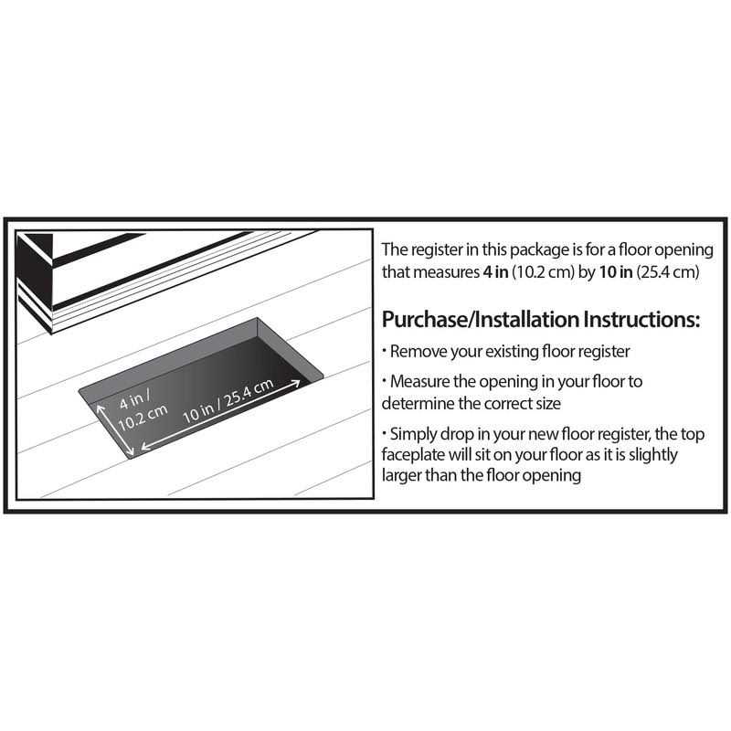 The Decor Grates Scroll Register provides an ideal solution to giving your home a new look on a budget. This brushed-nickel register serves as both a floor vent and a piece of decoration. A scroll pattern and brushed-nickel finish give the Decor Grates Floor Register a classically elegant appearance that can transform the look of an entire room. This decor grates floor register is 4 x 10 size and fits most standard floor register openings.