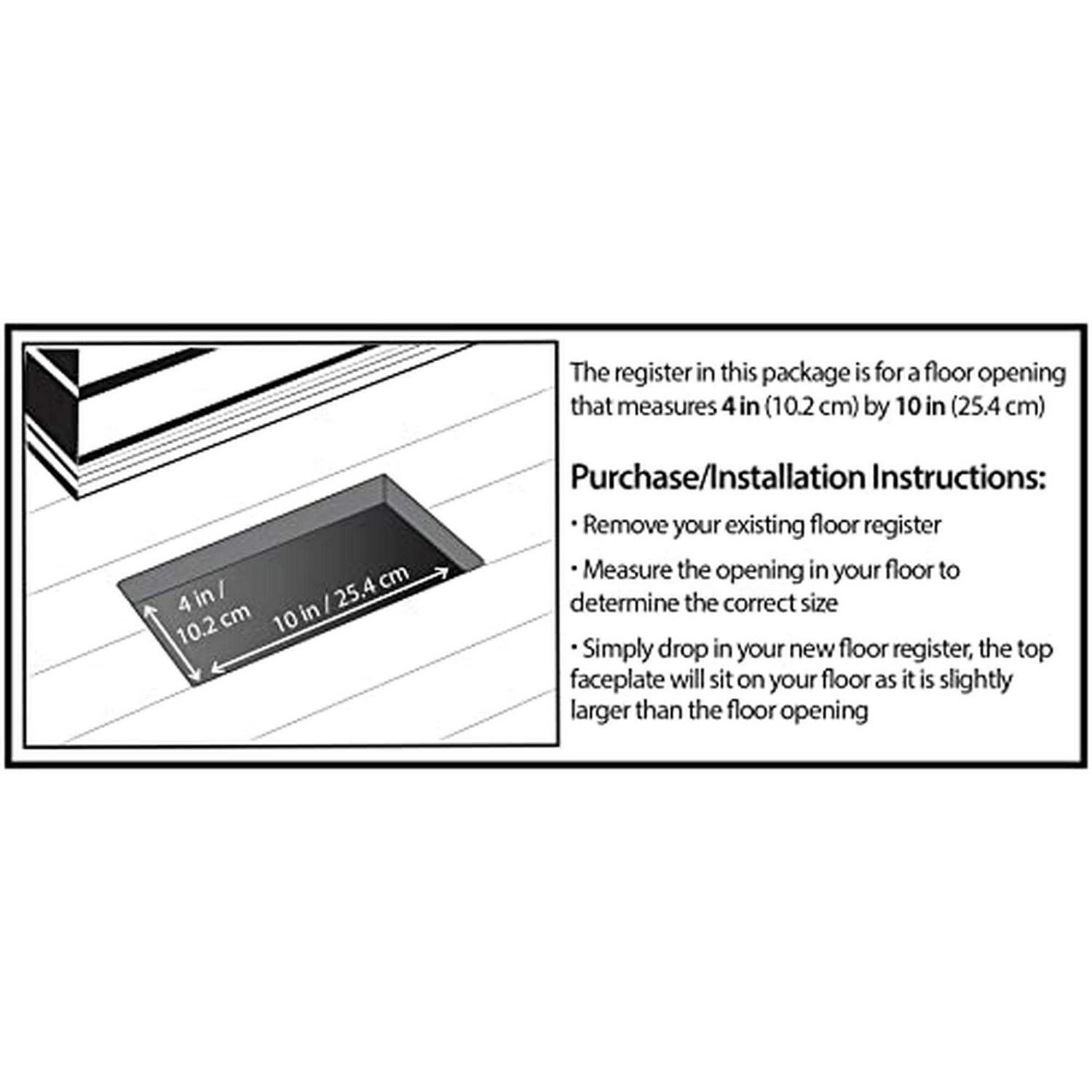 Each grate is designed for easy installation and operation, simply remove your previous grate and insert the new grate by dropping it into place. Air flow is controlled by the high impact damper box. To order the correct size simply measure the size of the duct opening. EAN: 0771308028460 Package Dimensions: 13.5 x 12.0 x 6.0 inches