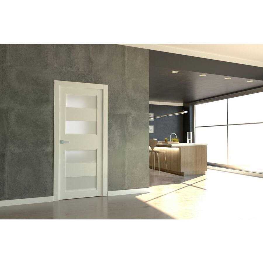 A DIY FRIENDLY pre-finished door. The glass panels give the door an outstanding view. The variety of shapes and combinations of glass and panels open up unique opportunities in decorating your home or office. The pre-finished panels are sided horizontally with the inlays of frosted glass, which in combination with sharp angles makes the door a unique design solution for any modern interior. The stiles and rails of the door are made of pine and the middle panels are made of a high-quality board coated with an eco-friendly Evo Pro finish. The panels are intermittent with the inlays of 1/4 in. thick frosted glass. Also, the modern design is accentuated by the inlay frosted glass in the middle. The door is coated with Evo Pro finish with a decorative pattern on it. It is a safe, durable, and eco-friendly material with a number of advantages.