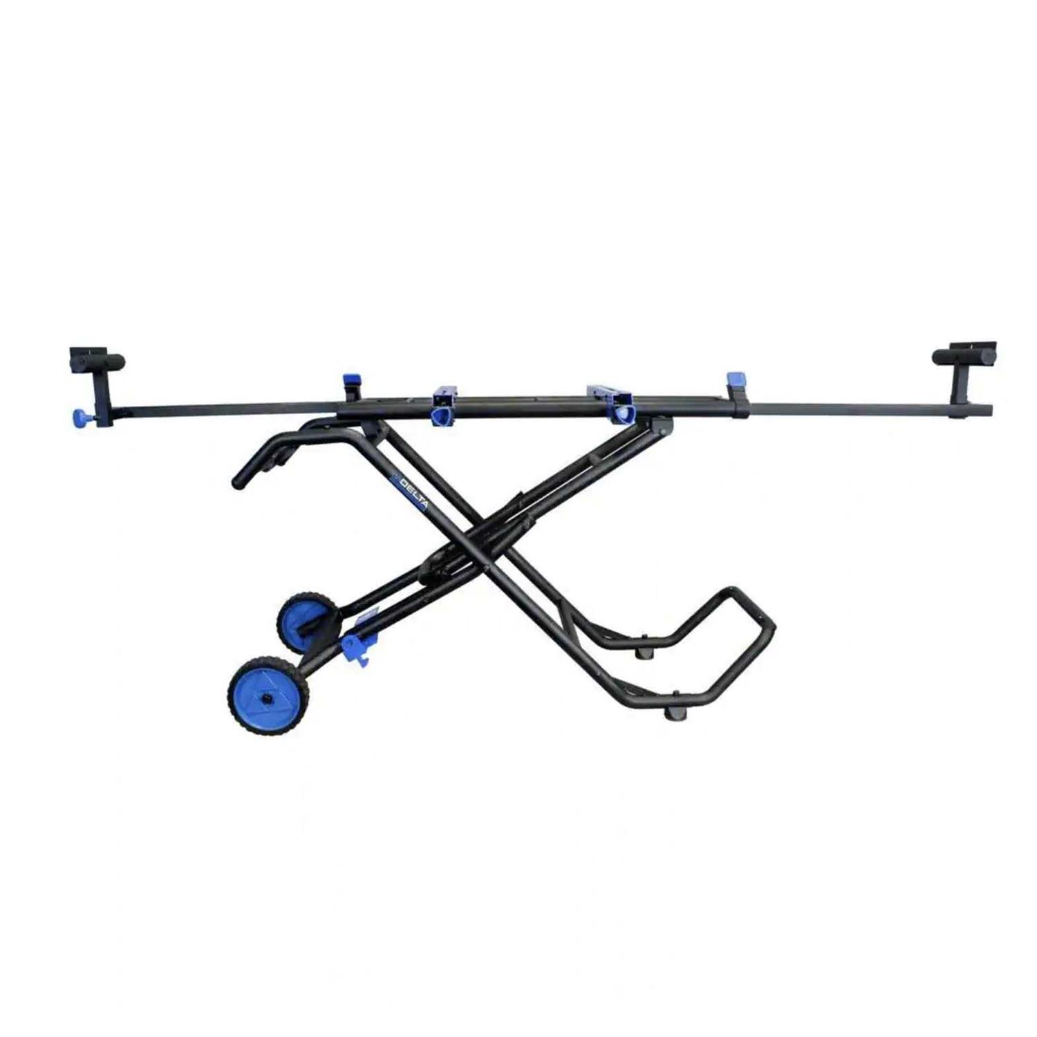 - Large wheels and wide rubber, semi-pneumatic, tires makes moving miter saws from one job to another fast and easy, even up and down steps