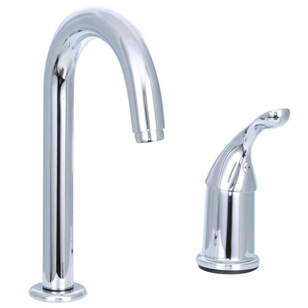 The Delta Classic Single Handle Bar/Prep Faucet model #1903-DST offers a sleek kitchen faucet replacement that is sure to wow your guests. This faucet provides a high arcing 5-13/16-Inch long 10-inch high spout that allows you to send water to hard to reach places in your sink thanks to a swivel radius of 180 degrees. This fabulous faucet is available in chrome stainless steel or Venetian bronze finishes. It also has a DIAMOND valve which is a diamond encrusted valve that provides durable craftsmanship for over five million uses. The faucet requires two holes for installation but provides easy to use single handle operation.