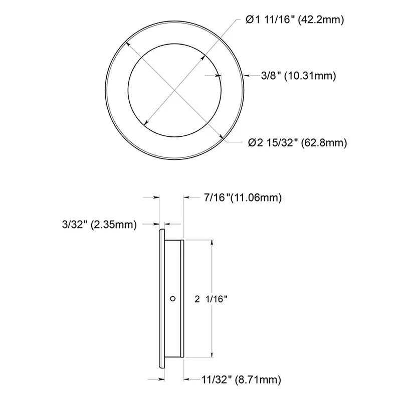 - Top of the depression measures 2-1/16 inches in diameter. Bottom of the depression measures 11/16 inches in diameter.