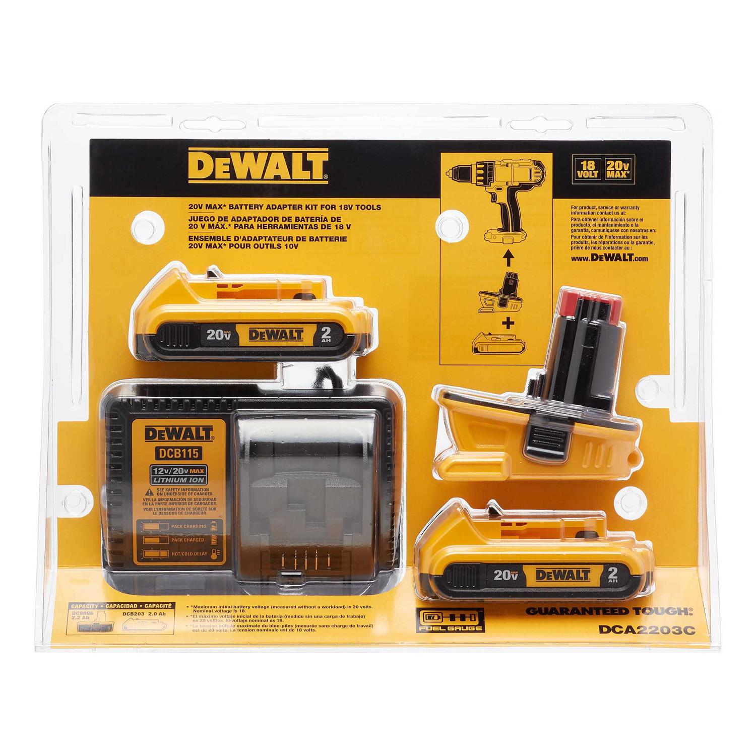This adapter requires the use of 20V MAX Chargers – this will not fit in 18V Chargers. This kit includes two 20V MAX XR Lithium Ion batteries and 20v charger so you can be ready to convert immediately. Use with Dcb201 Dcb203 Dcb203Bt compact batteries. Do not use adapter with premium batteries Dcb200 Dcb204 Dcb204Bt Dcb205 in 18V Compact drills Dc970 Dc759.