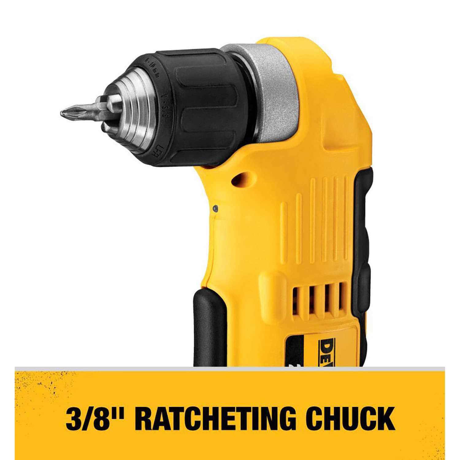 Drilling and driving in narrow or hard-to-reach places is no problem for this 20-volt right angle drill. The variable-speed motor delivers 0-650/200-RPM for flexibility on a wide range of applications and provides up to 360-UWO of power. The 3/8-in ratcheting chuck has a deep hex pocket which allows bits to be fully inserted for easy access to tight spaces. The lightweight design means you can use the drill for longer durations with minimal fatigue. A multi-grip trigger provides comfort and convenience while an attached belt hook allows you to keep the drill close at hand between tasks.