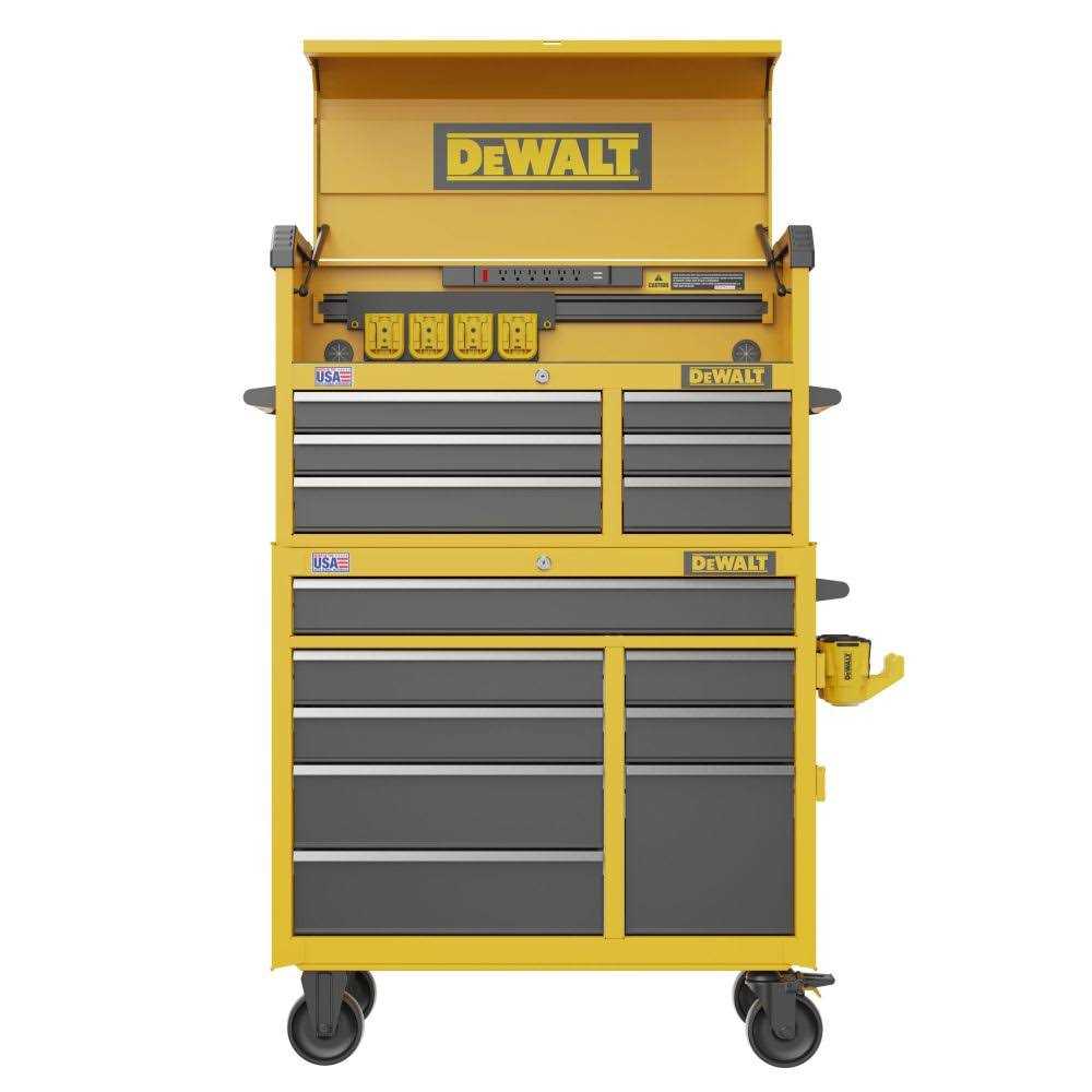Proudly made in the USA with global materials, the DEWALT Tool Storage System takes storage and organization to the next level. This metal storage has many features including the DEWALT Workshop Storage System for additional organization. Each chest comes with a metal rail mounted inside the chest, and a battery rail that organizes up to four DEWALT batteries (DEWALT 12V MAX, DEWALT 20V MAX, or DEWALT FLEXVOLT batteries) sold separately. Additional accessories like a charger mount, bins, standard hooks and more are available to customize and maximize your storage space, each sold separately. Each full-extension soft close, ball-bearing drawer supports up to 100 lbs., and a six outlet power strip keeps your tools charged. Internal locking and drawer liners help secure and protect your stored tools.