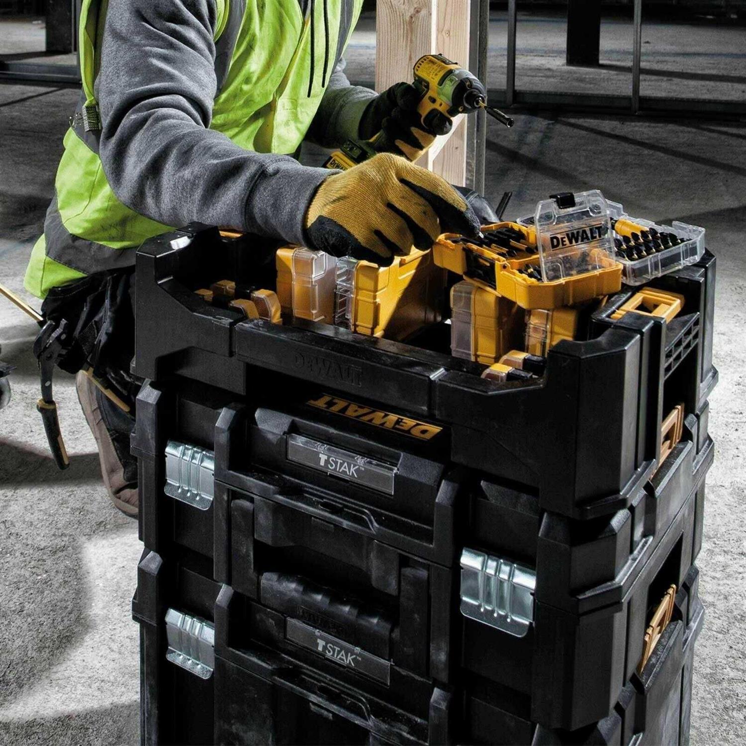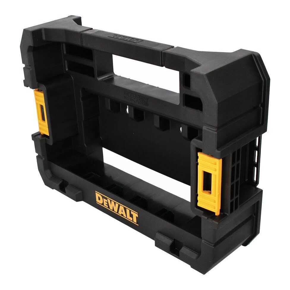 The DEWALT TSTAK Caddy has a tough, durable design made from 3mm polypropylene plastic. Stores up to 5 TOUGH CASE+ accessory cases and 4 small bulk storage cases (Tic Tac). The TSTAK interlocking storage system allows toolboxes to be interconnected and configured to meet the user’s needs. Engineered plastic side clips to enable numerous boxes to be stacked and held securely together for transport. The DEWALT TSTAK Caddy has a tough, durable design made from 3mm polypropylene plastic. Stores up to 5 TOUGH CASE+ accessory cases and 4 small bulk storage cases (Tic Tac). The TSTAK interlocking storage system allows toolboxes to be interconnected and configured to meet the user’s needs. Engineered plastic side clips to enable numerous boxes to be stacked and held securely together for transport.