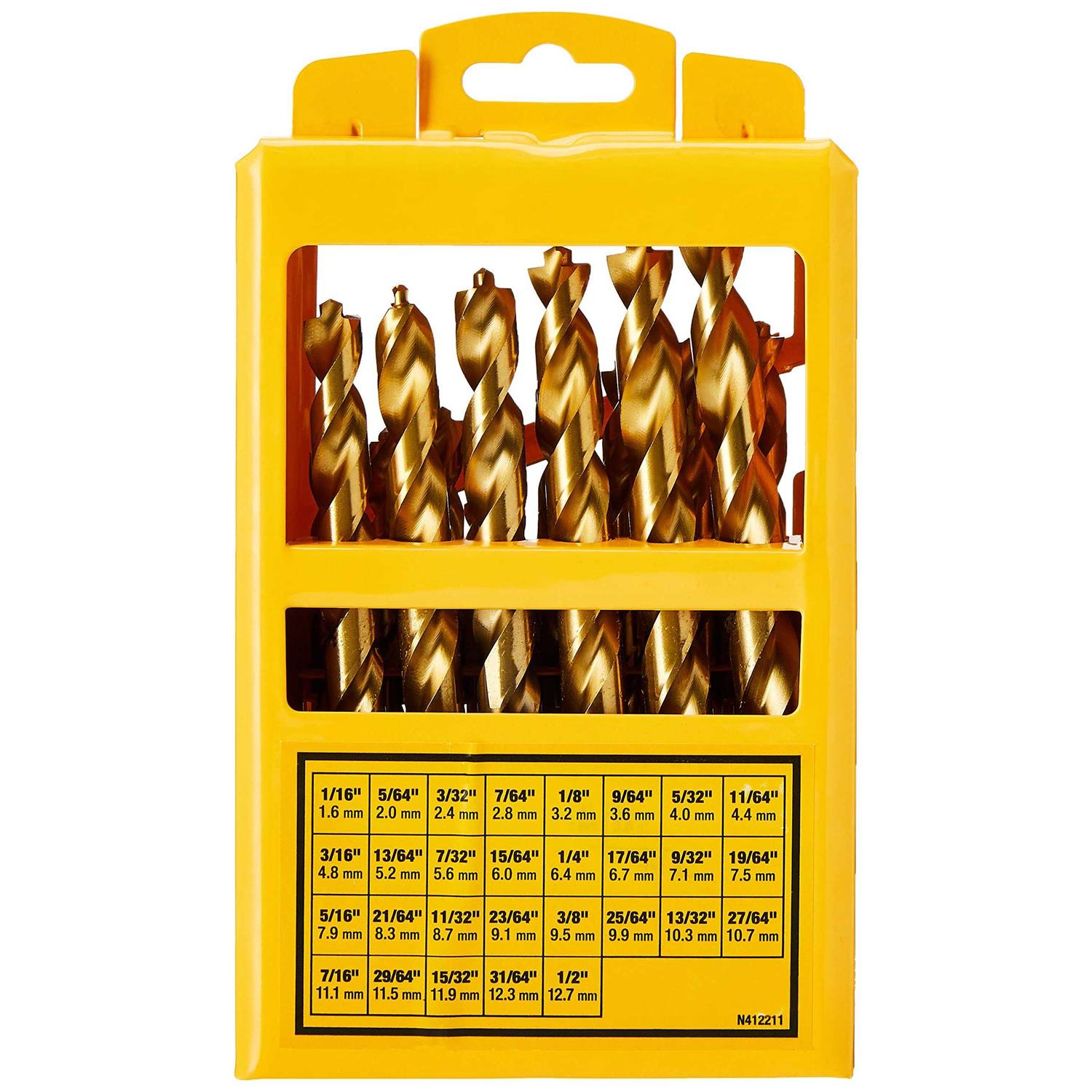 DeWalt’s titanium drill bits have a titanium coating that provides longer life when drilling in non-ferrous metals. These bits are also suitable for drilling in wood and plastic and are ideal for commercial and residential applications. Includes sizes from 1/6 to 1/2-Inch in a tough case.