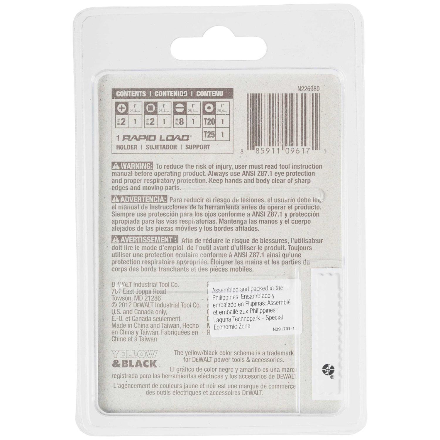 Speed up your your workflow with the DeWalt 2507 6 Piece Rapid Load Set. This set includes a rapid load holder, with five 1 inch bits in common head sizes and drives to ensure youve got what you need to get the job done. The Rapid Load Holder features the SureSet system, which uses magnets to hold fasteners securely, freeing up your hands and keeping them out of harms way. The Rapid Load system can replace the drive guide on impact drivers and power drills and is suitable for any application. Get everything you need to get the job done more quickly and with less fuss in the DeWalt 2507 6 Piece Rapid Load Set.