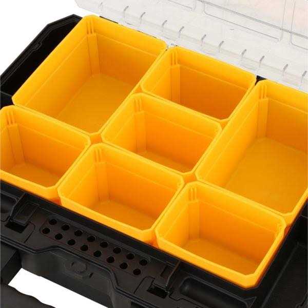 With 9 removable plastic bins and a see-through lid side latches allow connectivity for easy carrying and safe stacking. Removable compartments for small parts and accessories and once removed for power tool and charger. Clear and impact resistant unique lid design locks all compartments in place full visibility for quick access. Built in wide handle for easy and stable portability and metal hinges and latches.