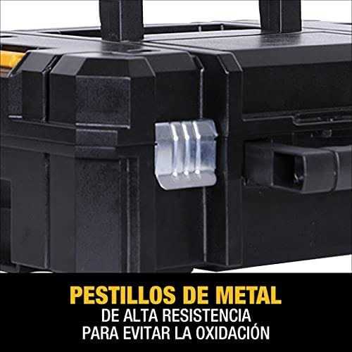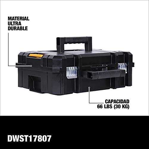 he DEWALT DWST17807 TSTAK II flat top toolbox organizer offers new innovation in DEWALT storage options. This flexible platform allows different combinations; all units can stack on top of each other and are able to connect with durable side latches for easy carrying and safe stacking. The bi-material handle on top of each unit allows for easy and comfortable lifting and heavy-duty metal latches protect against rust. Dimensions: 332 x 440 x 163mm Weight capacity: 30kg Flexible platform allows different combinations Bi-material handle on top of each unit for easy & comfortable lifting All units can stack on top of the other, connected with durable side latches Heavy-duty metal latches for rust resistance