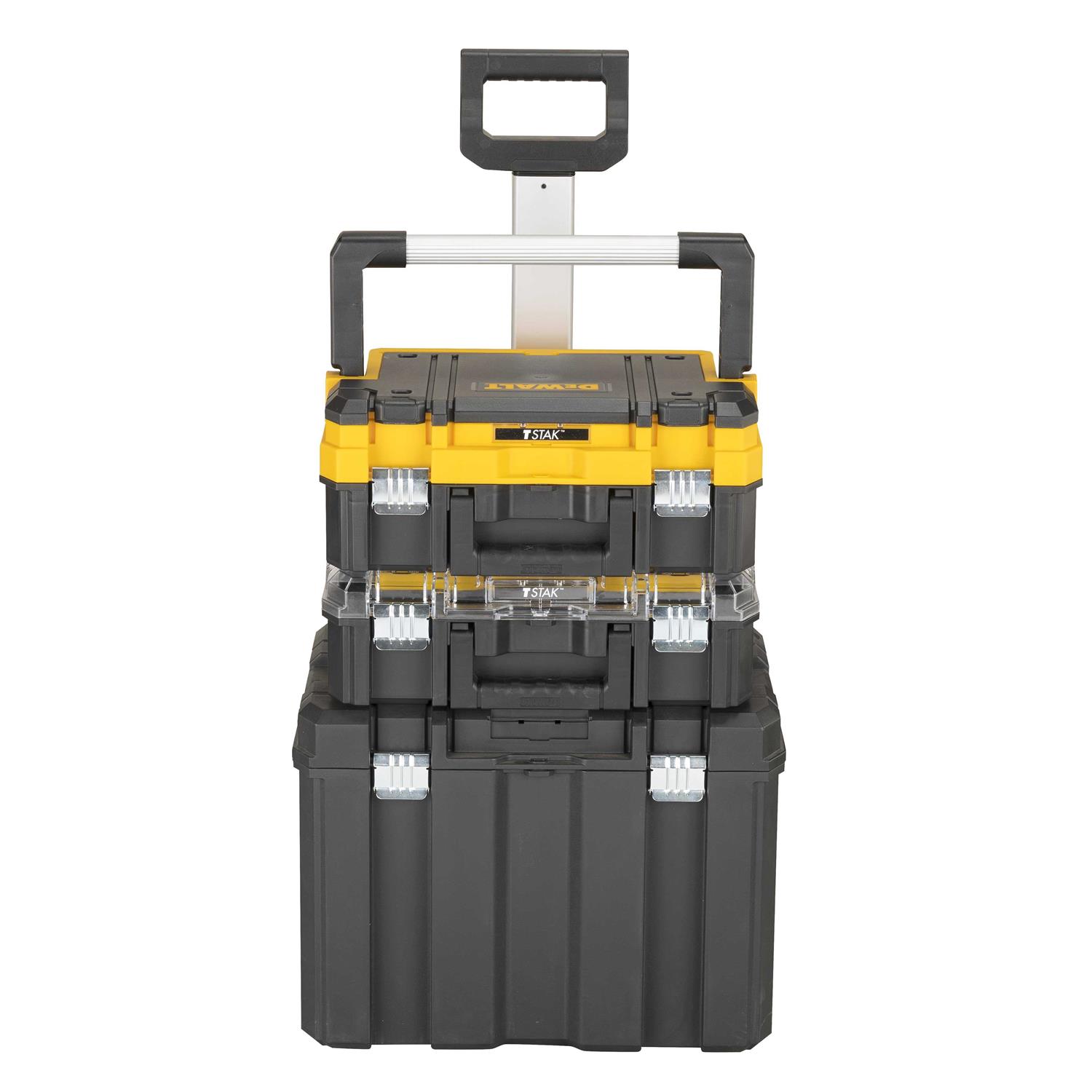 DeWalt Tstak Modular Mobile Tower is storage system includes: long handle with organizer top, clear lid organizer and a mobile storage unit. The TSTAK platform provides optimal storage and organization solutions for the jobsite and home. They can also be stacked to each other and to other TSTAK modules for secure and easy transport.