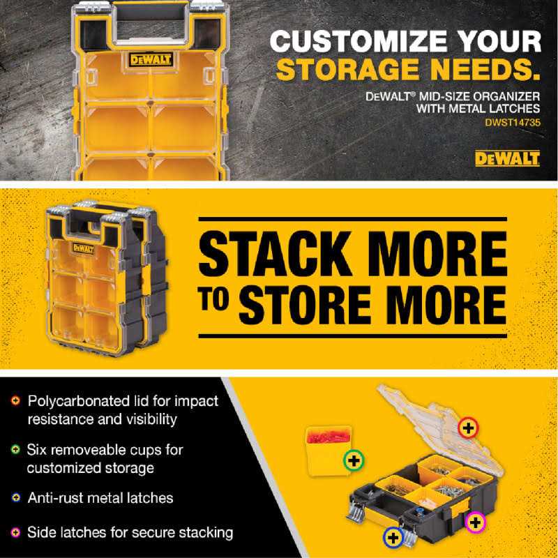 DescriptionMid-Size Pro Organizer with Metal LatchesThe mid-size deep pro organizer is ideal for jobs that require keeping track of small parts. The case has been engineered for durability with a heavy-duty body and sturdy metal latches. The compartments are also removable, making it easier to use on the jobsite.
