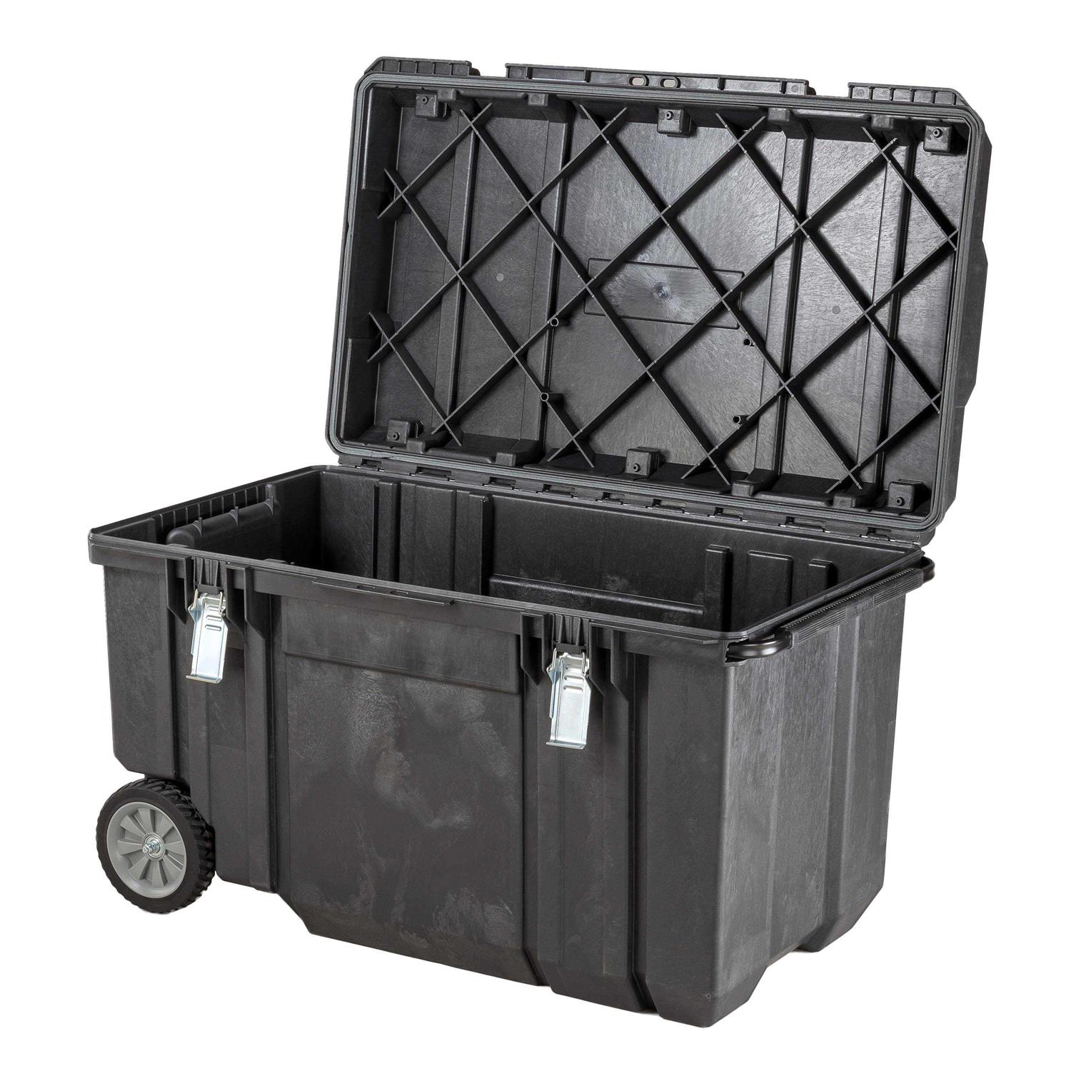DEWALT tough chest mobile storage introduces steel top rails for top loading. Tool boxes saw horses and other items can be secured to the top of the tough chest mobile storage with bungee cords. It features heavy-duty 8 In. rubber wheels for maneuverability over the rough jobsite terrain and includes a water seal and durable corrosion resistant metal latches. Tough chest mobile storage delivers 110 Lbs. of load capacity and 63 Gallon useful volume.