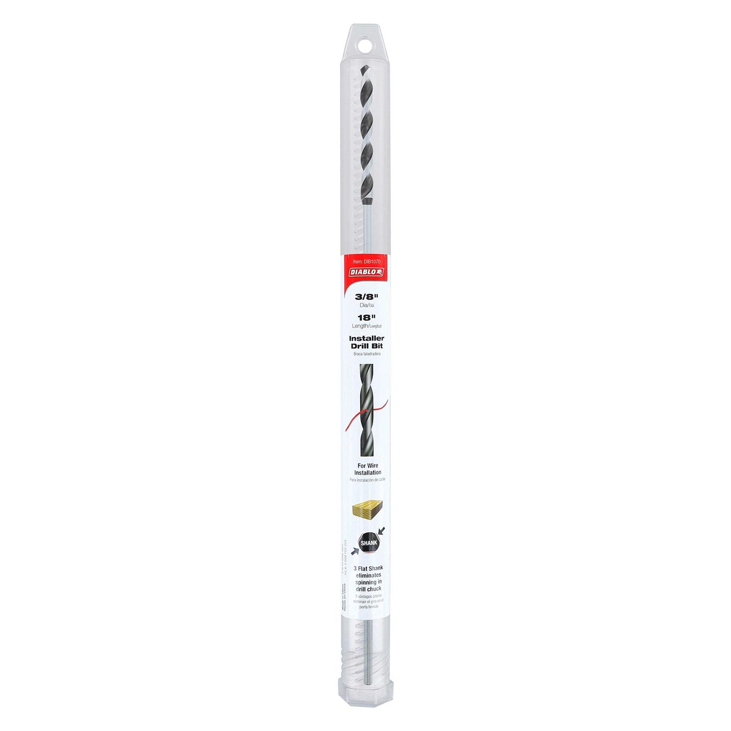 Diablo s Installer Drill Bits offer premium performance and superior life in wire installation projects. An ultra-sharp tip maximizes durability for fast, straight holes in clean wood or stacked lumber. Black oxide coated flutes prevent debris build-up for fast chip removal. The small hole in the flute makes feeding cables and wires effortless. The 3-Flat Shank provides extra stability by eliminating spinning in the drill chuck.